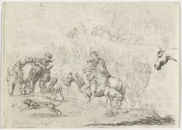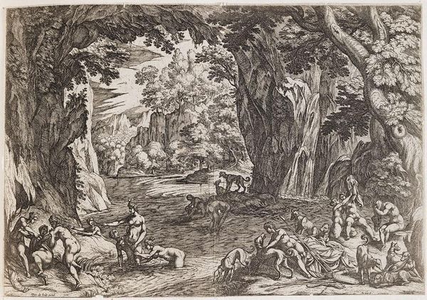 Editor: Here we have Jacob Herreyns' "Venus vindt de dode Adonis," created sometime between 1671 and 1732. It's a delicate sketch, seemingly pen and ink on toned paper. There’s a real sense of theatricality, almost like a stage design. What kind of stories do you think this piece is trying to tell us? Curator: Considering its mythological subject, that theatricality you observe points to the importance of visual culture during this period. Prints like these, affordable and reproducible, served as crucial tools for disseminating narratives and ideals. Venus's grief over Adonis was not just a sad tale; it symbolized broader anxieties around mortality, loss, and even perhaps, the transience of power and beauty itself, particularly in a courtly context. Editor: So, it’s not just a picture; it’s almost a commentary? Curator: Precisely. Think of the role that mythological paintings and prints played in reinforcing social hierarchies. Who got to depict these stories, and for what audience? Herreyns likely understood his market and shaped his art accordingly. Consider also the visual rhetoric - Venus is always shown as ideal of beauty; is this subverted at all here? Editor: That’s really interesting! It makes me consider where this artwork was shown, and who had access to it at the time. Thanks for the deep dive. Curator: It's precisely these questions that breathe life into historical artworks and makes them worth analyzing today!