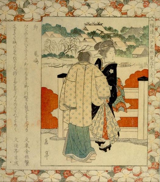 Curator: The first impression I get is how strangely melancholy this is. The muted colours... it isn't what I expect of a Utagawa print. Editor: Well, let's dive in. This 'kakemono-e', a vertical panel print, depicts a courtesan by Utagawa Yoshitora. Note the intricate patterns, especially in the kimono. How does the composition strike you? Curator: The layering of the garments creates a play of visual fields. The floral designs juxtapose against the speckled dark fabric, almost a visual echo of the status and artificiality inherent to her profession. Editor: Absolutely. Consider also the role of such images in Edo society—the licensed quarters, the complex hierarchy... these prints were powerful social documents reflecting desires and status. Curator: In that context, the dogs at the hem of the kimono become much more than decoration. Editor: Indeed, symbols of playfulness, wealth, and perhaps even the fleeting nature of beauty and desire. A complex image. Curator: Yes, more complex than I initially perceived. The artist makes deft use of signs. Editor: It's a potent reminder of art's relationship with social structures.
