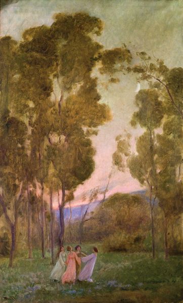 Editor: So here we have David Davies' "Friendly Society's Gardens" from 1888, rendered in oil paint. It's giving me a very quiet, contemplative mood, almost melancholic with those bare trees against the twilight. How do you interpret this work? Curator: It's fascinating how Davies, an Australian artist, engaged with Impressionism here. Instead of Paris, we see an exploration of the suburban and the rural, reflecting anxieties and aspirations regarding class and leisure in Australian society. Consider the title: “Friendly Society’s Gardens.” Do you get a sense of that societal aspect from the artwork itself? Editor: Hmm, not overtly. It seems more focused on nature than social activity. I’m also seeing the influence of Naturalism in its grounded, observational approach, particularly in how the light is rendered. Curator: Precisely! The use of plein-air is interesting when we consider the burgeoning art market and the increasing importance of exhibitions. A landscape like this invites a sense of belonging but also reflects upon the changing dynamics of land ownership and access for leisure in a rapidly developing colony. Is this painting merely representational, or do you feel Davies aimed for more? Editor: It’s making me think about how parks were created for public benefit and social mixing, while often being located in areas that reflected the status of certain suburbs. Maybe it shows how nature, even in public spaces, became part of a social performance? Curator: An insightful point! And this tension between nature, public space, and social stratification is key to understanding not only Davies' work but also the role art plays in shaping and reflecting societal values and anxieties. Editor: I'm beginning to see this seemingly tranquil landscape as a document reflecting socio-economic developments! It's more than just a pretty scene. Curator: Exactly. By examining its context, we unveil layers of meaning and social commentary embedded within the art itself.