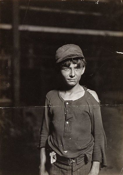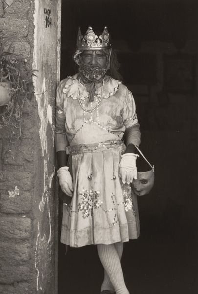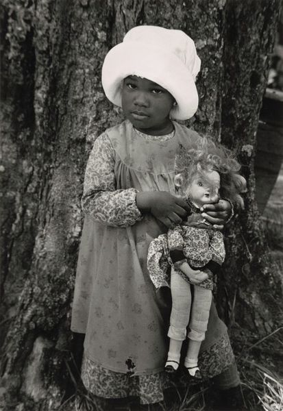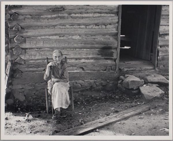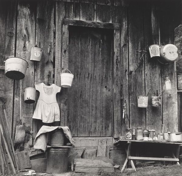 Curator: Here we have Alfred Stieglitz’s gelatin-silver print, “Black Forest Girl,” believed to have been taken sometime between 1894 and 1934. Editor: The first thing that strikes me is the weight of it. The dark doorway, the rough wood, even the heavy dress and full pail – everything feels substantial, rooted in place. Curator: Absolutely. Stieglitz, a key figure in pictorialism, often sought to elevate photography to the status of fine art, and here, the meticulous detail captures a specific social context, doesn't it? The girl, her traditional garb... Editor: It's clearly staged, though. You see how her dress hangs, the deliberate placement near the doorway... It makes me think about the labor involved – not just hers, hauling the pail, but also Stieglitz's: setting the scene, processing the gelatin silver. This is not a snapshot; it’s a constructed reality meant to signify a life tied to production and traditional values. Curator: Exactly! Think about the romanticized notions of rural life, the idealized image of women connected to nature that permeated European art at the time. Stieglitz both participates in and, perhaps, subtly questions this trope. Consider her expression – it’s far from blissful. Editor: Yes, there’s a quiet defiance, maybe even weariness in her gaze. It raises questions about exploitation of labor, particularly gendered labor. The "Black Forest Girl" becomes a symbol not only of picturesque Germany, but also of a certain class structure made visible through dress and possessions – the simple pail, her worn shoes. Curator: And by extension, the photographer's own social standing, doesn't it? His ability to represent this girl, framing her narrative. It’s about who has the power to represent whom and how. Editor: The photograph’s material presence reinforces that power dynamic, especially when viewed today in the context of labor debates, material culture, and post-colonial frameworks. What at first appears to be a simple image actually has layers of meaning. Curator: Precisely. It speaks volumes about constructed identity and the weight of historical representation. Editor: For me, seeing the process behind that construction only reinforces the questions raised by her quiet gaze.