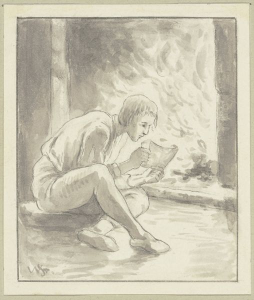 Willem Witsen rendered this watercolor drawing of a seated girl surrounded by military props, with no date specified. The juxtaposition of innocence and martial symbolism creates a striking visual tension. Note the details: the ballet attire, the forlorn expression of the girl, and her clasped hands supporting her face. Her posture speaks to a universal posture of melancholy. Consider the inclusion of the sword and drum as symbols of war and power. We are reminded of Jacques-Louis David's 'Oath of the Horatii' from 1784, where gestures similarly convey intense emotional states. This tension between childhood and militarism can be found in other contexts throughout history, reflecting a deeper, perhaps subconscious, unease with the encroachment of conflict on innocence. The image, therefore, is a visual paradox. It speaks to the complex interplay between fragility and strength, and between the world of play and the looming specter of conflict. This cyclical progression invites contemplation, resonating across generations.