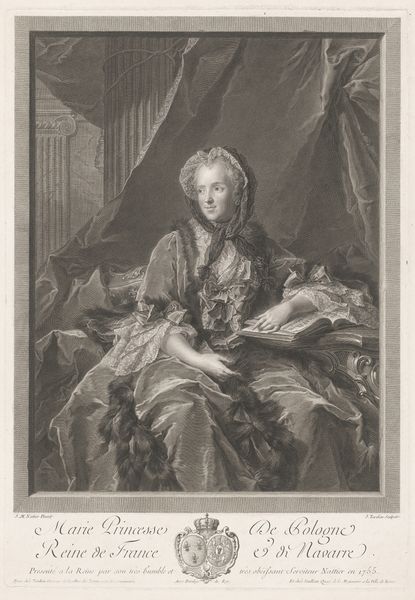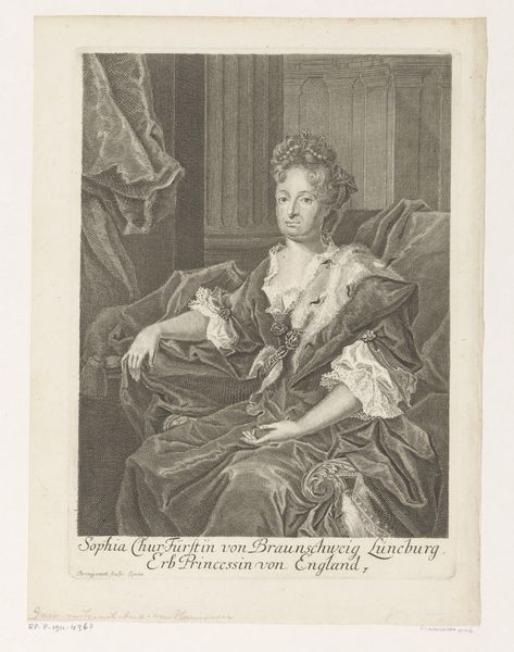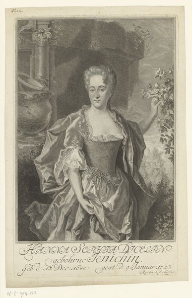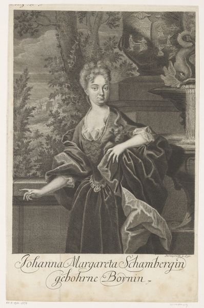Here is the audio guide script: Martin Bernigeroth created this portrait of Johanna Henrietta Albrecht, likely sometime around the late 17th to early 18th century, using engraving techniques. The composition immediately presents us with a play of textures and forms. Notice the contrast between the smooth skin of Johanna and the rich, draped fabrics that surround her. The folds in her dress and the curtain behind her are not just decorative, but structural. They create a sense of depth and movement that counters the stillness of her pose. The architectural column to her right adds a classical element. Bernigeroth masterfully uses line and shadow to convey the materiality of each element. The varying densities of the engraved lines suggest different textures from the velvety dress to the delicate lace. This attention to detail encourages us to consider how Johanna is presented. Does the structured background and her composed demeanor reinforce social hierarchies, or does the softness in her expression suggest a more personal narrative? As always, the reading remains open.