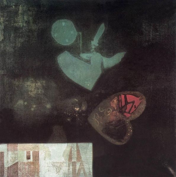 Editor: Endre Balint's "Vision at Rouen," created in 1961 using acrylic paint, strikes me as incredibly dreamlike, almost unsettling. The forms feel both familiar and alien. What do you see in this piece, and how do you interpret it? Curator: This painting, to me, is deeply rooted in the sociopolitical anxieties of the post-war era. Look at how the geometric shapes clash against each other, creating a sense of unease. Do you see the disjointed human figure and fragmented architectural elements? They reflect the fractured sense of identity and displacement prevalent in the wake of global conflict. Editor: I hadn't thought of it that way. I was focusing more on the artistic style, that’s interesting. Curator: And let’s consider the title, "Vision at Rouen." Rouen, a city with a rich but also turbulent history, became a focal point during the war. Balint may be referencing the shattered remnants of both personal and collective memory, asking us to confront a difficult past in order to build a more conscious future. How does this revised lens resonate with you now? Editor: I think that definitely shifts my perspective on the piece. It makes me see the abstraction less as arbitrary and more as a deliberate commentary on the fragmentation of society and experience. The dark background almost feels like a stage. Curator: Exactly! By grappling with such topics, Balint implicates us, the viewers, in an active dialogue around identity, memory, and the responsibility we have to interpret and shape history. What lessons could this historical context share with modern sociopolitical views? Editor: I never considered art’s conversation about historical traumas and it makes me consider how art impacts society today. Curator: That’s exactly what makes this piece so compelling and relevant! It offers a critical reflection on the past, prompting us to examine its impact on our present.
