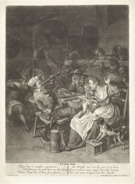 Curator: This artwork is titled *Bagpiper at an Inn*, created by Cornelis Dusart. It’s oil on canvas and is estimated to date from 1675 to 1704. Editor: Initially, I’m struck by its monochromatic palette. It looks like it emphasizes raw textures and humble settings, doesn’t it? Curator: Precisely. Genre paintings like this offer a fascinating glimpse into the social dynamics of the Dutch Golden Age, and the bagpiper holds a prominent place. Musicians are often symbols of merriment, but sometimes they indicate social instability or foolishness. Editor: I see that, and the means by which that merriment, or instability, is funded certainly comes into play here. Notice the barrels, suggesting the economic backbone of the scene are likely related to taverns, trade and alcohol. And, looking closer, it’s easy to identify the wear and tear evident in the visible brushwork. This wasn't some quick sketch; Dusart meticulously layered paint. Curator: Note, too, the way Dusart positions the piper almost centrally, creating a focal point from which our eyes wander to the surrounding characters—a man dozing by the table, the others crowding in close, and the sleeping dog below. The symbols of revelry but also quiet rest… it’s really a wonderful composition. Editor: Absolutely, and speaking of composition, it makes me consider the pigments Dusart used, now faded with time. What were his considerations around paint mixing and light, I wonder? The materials chosen played just as much a part in shaping that Golden Age's culture, right? Curator: Without question. By observing these everyday scenes with this careful composition, artists of that era offer insight into not just their materials, but also into universal emotions, societal behaviors, or hidden meanings that continue to resonate centuries later. Editor: And, thinking of what labour and artistry were poured into each painted square of that canvas is impressive to remember. This peek at past making invites deeper engagement with how art mirrors life across time.