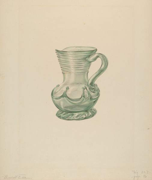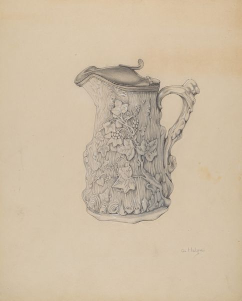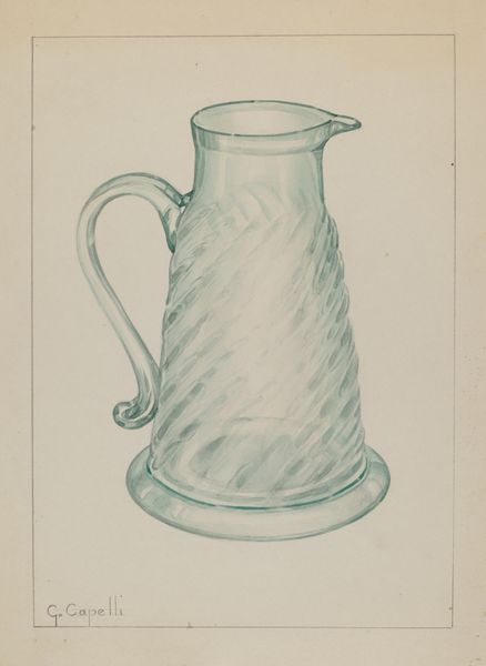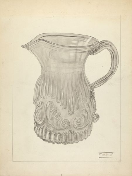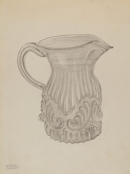 Editor: So, here we have Janet Riza's "Cream Pitcher" from around 1936, a pencil drawing of, well, a cream pitcher. I’m struck by its simplicity. What can you tell us about it? Curator: This piece offers us a window into the representation of domesticity in art during the 1930s. How might a seemingly simple image of a cream pitcher reflect broader social values and ideals of that period? Editor: That's a great question. I guess it makes me wonder about the role of design and everyday objects as reflections of societal aspirations. Curator: Precisely. Consider also how the act of drawing, of meticulously rendering an everyday object, elevates it. Does this act change our relationship to the pitcher? In what way might the artist’s careful representation speak to the changing roles of women in design or craft during this time? Editor: Hmm, interesting point about elevating the object. It definitely makes me consider how something functional can also be art, depending on the context and the intent. Curator: And further, who was this art *for*? Was this for an exhibition, or study for mass-produced goods? Who *could* afford fine tableware during the depression, and what does depicting *this* pitcher tell us about who Janet Riza’s audience was? Editor: I hadn't even thought about it that way. The economic backdrop of the 1930s completely changes my perspective on this seemingly simple image. It invites all kinds of reflections. Curator: Exactly! The power of art, I find, lies in revealing hidden narratives behind what we often overlook. It has opened our understanding in a totally unexpected and welcome way. Editor: Agreed! It is truly amazing to consider the story that this object, seemingly very straightforward at first glance, holds about art, social classes and gender roles.