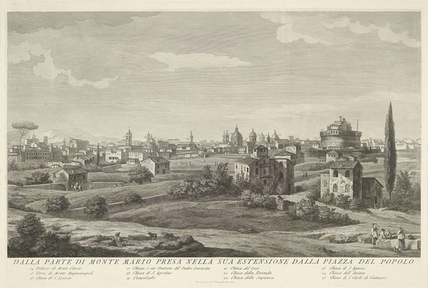 Editor: This is *Panorama van de stad Rome (linker deel)*, or *Panorama of the city of Rome (left part)*, an etching and engraving by Giovanni Volpato, dating from 1743 to 1803. It gives me a feeling of historical distance; everything looks precise, carefully laid out. What catches your eye when you look at this piece? Curator: The immediate draw is the meticulously constructed composition. Volpato utilizes a sophisticated system of perspective, guiding the viewer’s eye from the foreground – the somewhat darker and more detailed lower section – toward the more diffused and lighter city skyline in the distance. Note the almost geometric arrangement of the landscape; how would you describe the tonal range deployed? Editor: Well, the tonal range is fairly narrow; it's almost monochromatic, consisting mainly of light greys and faded whites. It really flattens the space. Is that a deliberate choice to emphasize the architecture? Curator: Precisely. The restricted palette and delicate hatching technique serve to highlight the architectural forms and the clear delineation of space. Notice how the architectural elements—the domes, the towers— punctuate the skyline. They create a rhythmic sequence that is quite pleasing to the eye. The print offers a study of contrasting textures—smooth versus rough, detailed versus sparse. How do these textures interact, do you think? Editor: The rough textures in the foreground and subtle pencil strokes direct my eyes to move throughout the landscape. It highlights that contrast you noted! So it’s more than just a pretty picture; the composition creates relationships through different elements that draw the eye to engage more deeply. Curator: Indeed. By deconstructing its formal elements we can analyze the success with which Volpato’s landscape has managed to depict an idealized rendition of Rome using purely structural qualities. Editor: This has given me a deeper appreciation for how printmaking can be used to both document and interpret a scene, paying close attention to the formal elements. Thanks!