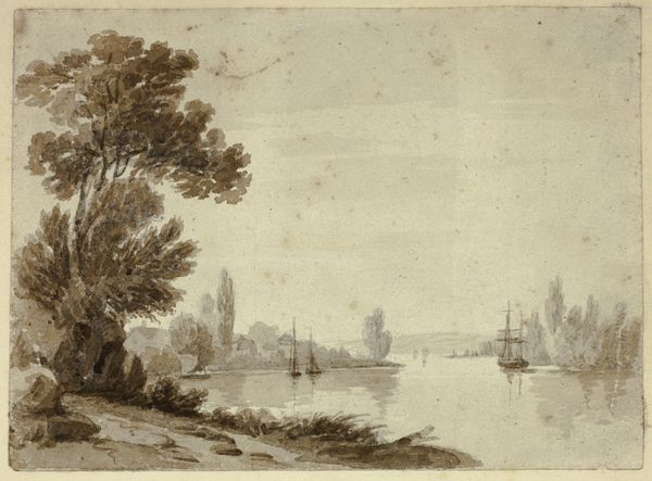 Curator: Let’s consider this compelling landscape drawing here at the Städel Museum. Rendered in pencil, ink, and wash, this baroque era piece is titled "An einem Flusse ein Kalkofen, in welchen eine Pritsche führt" – a rather descriptive "A Lime Kiln on a River, Leading to a Berth." The artist is Hendrik Spilman. Editor: My eye immediately goes to the strong contrast of the lime kiln juxtaposed against the lively scene on the water. The architectural form feels weighty and permanent in comparison to the bustling river traffic. Curator: That kiln is indeed a dominating presence. Historically, these kilns were often situated along waterways to facilitate the transport of limestone and the quick distribution of lime, essential to construction and agriculture at the time. It’s interesting to observe the presence of industry alongside scenes of everyday life and leisure. It speaks volumes about the era’s reliance on riverine infrastructure. Editor: Yes, that interplay tells a story. Lime often symbolizes purity and transformation, doesn't it? The presence of a religious building's spire along the horizon reinforces that symbolic connection – almost as though this transformation happening at the kiln has a transcendent parallel in society. Curator: I hadn't considered that connection, fascinating! It underscores how these seemingly mundane industrial structures were actually quite central to the social and economic fabric. It highlights the intersection of landscape, labor, and the broader social order. Editor: And look at how figures, presumably workers, move to and from it. Do you suppose they're crossing a symbolic bridge between the toil needed to sustain life, and a more hopeful future promised by a sacred way of life in that spire in the background? I see echoes of alchemic transformation. Curator: An intriguing perspective. It reveals how Spilman's seemingly simple depiction of a landscape can unpack much larger, societal commentaries. I like how you observed that detail of workers traversing to and from the kiln - so the bridge becomes a device Spilman has added for our interpretations, adding further layers for modern audiences, while also revealing details for 18th-century contemporary interpretations. Editor: Indeed. There’s a certain beauty in how a functional piece of infrastructure like this can become infused with broader, lasting meaning, if only we slow down to reflect on it. Curator: Well, I've learned to appreciate lime kilns much more profoundly today. Editor: As have I. This landscape drawing provides an interesting portal to reflect on those social forces and symbolisms.