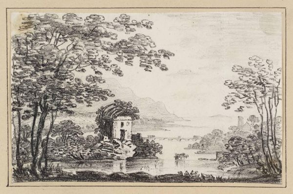 Frederik Ludvig Bradt made this landscape print in Denmark. The image presents a vision of nature that is both idyllic and tamed, a quality much admired by the middle classes of the late 18th century. Here, Bradt offers us a serene view of a Danish landscape. We see a body of water, likely a lake or a calm bay, framed by lush trees. In the background, a castle sits atop a hill, overlooking the scene. Two figures are sitting by the water's edge, perhaps enjoying the view. In the water, a boat filled with people suggests leisure and travel. The print was made during a time when Denmark was experiencing a period of relative peace and prosperity. Artists were patronized by the royal court. Prints like this one catered to a growing market for picturesque views of the Danish countryside. To understand Bradt's work more fully, one might delve into the aesthetic theories circulating at the Royal Danish Academy of Fine Arts. Exploring such resources enables us to appreciate the social life of this image.