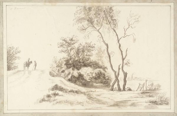 Editor: So this is "Omheind weiland naast een bomengroep," or "Fenced meadow next to a group of trees," a pen and ink drawing by Andreas Schelfhout, from around 1811. It's so delicate. I’m curious – what story do you think the materials tell in this piece? Curator: Well, think about the availability of paper and ink at this time, and for whom these materials would have been accessible. This isn't about some grand statement, but perhaps about capturing a specific landscape tied to land ownership. That humble fence, rendered in the same ink as the seemingly “natural” trees… does that disrupt the typical romanticism tag we often see attached to these scenes? Editor: That's interesting. It shifts my perspective completely. I initially saw a simple landscape, but you're highlighting the socioeconomic aspect tied to its creation and the way nature is being commodified here. Curator: Precisely! The controlled, almost industrial quality of the marks that form the foliage, mimicking textures. Consider also the *time* involved in this repetitive mark-making, suggesting labor not just in the *subject* of the drawing but *within* the act of its production. The way ink and paper intersect allows the artist to both conceal and reveal economic relationships in what might appear like a harmless scene. Editor: So, the seemingly simple act of sketching with pen and ink becomes a loaded commentary on land, labor, and resources? Curator: Absolutely. The materials and techniques used in this drawing open a window into the social and economic conditions of Schelfhout’s time. Even Romanticism, here, is materially produced and thus intrinsically related to processes of ownership. Editor: I'll never look at a landscape drawing the same way again. Thanks, that’s fascinating! Curator: My pleasure! Examining art through its materiality opens up many overlooked layers of understanding.