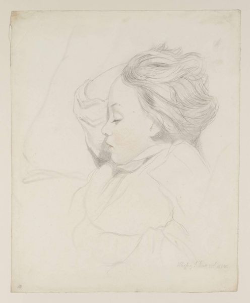 This delicate drawing of Vicenzo, made in 1857 by Frederic Leighton, is rendered in graphite on paper. It’s a study for a larger painting about Romeo and Juliet. Think about how Leighton builds up the image with countless tiny strokes. Graphite, essentially processed carbon, allows for a remarkable range of tonal variation depending on the pressure applied. The paper, probably made from processed linen rags, provides a receptive surface. This combination of materials allows for the creation of subtle nuances in light and shadow, lending a sense of depth and volume to Vicenzo's face. But beyond its technical facility, the drawing also speaks to Victorian ideals of beauty. It's an example of labor, in that Leighton had to make a sketch before making the painting, and also of class. Leighton's skill is evident not only in his ability to capture Vicenzo's likeness, but also in his masterful handling of humble materials, elevating them to high art. Ultimately, this drawing reminds us that even the simplest of materials can be transformed into something extraordinary.