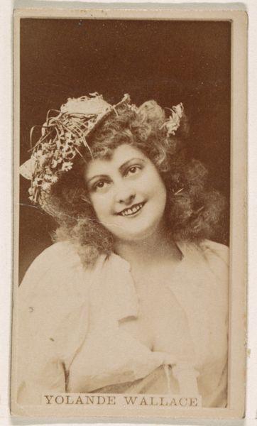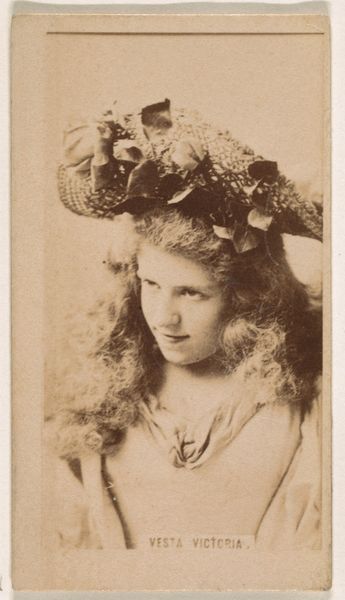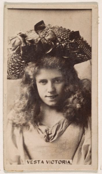 Editor: Here we have a promotional cigarette card dating from the 1890s, featuring the actress Vesta Victoria. I’m struck by the detail in her elaborate feathered hat. What can you tell us about how this image reflects the social landscape of the time? Curator: This seemingly innocuous portrait provides a lens into the socio-political dynamics of the late 19th century. The mass production of such cards was deeply intertwined with industrial capitalism, exploiting labor and popularizing tobacco use, arguably at the expense of public health. It simultaneously represents the rising status of women in entertainment. Can you spot a tension here? Editor: It feels like there’s a conflict. On one hand, this card showcases Vesta Victoria, a woman achieving fame in the public sphere, suggesting female empowerment. On the other, she's essentially being used to sell cigarettes, reinforcing a patriarchal structure where women’s images are commodified for commercial gain. Curator: Precisely. Furthermore, consider the colonial implications. Tobacco production often relied on exploited labor in colonized lands. The card thus becomes a tiny yet potent symbol of interwoven systems of power – capitalism, colonialism, and patriarchy – shaping both artistic representation and lived experiences. Editor: So this little card speaks volumes about a complex historical period. I’ll definitely look at similar images with new eyes. Curator: Indeed. It reminds us that even the most commonplace objects are loaded with meaning and historical context, offering a chance to excavate power dynamics that continue to resonate today.