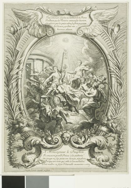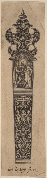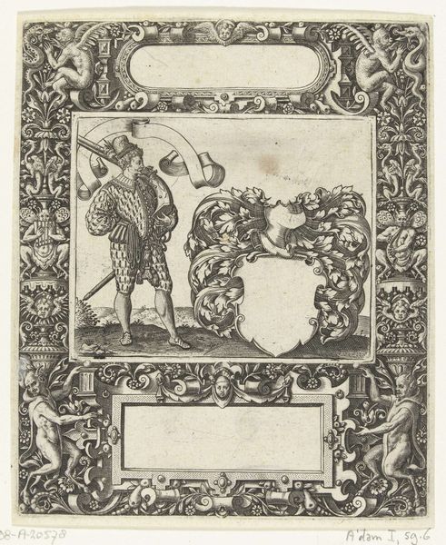 Editor: Here we have "Omlijsting met cartouches," or "Frame with cartouches," created in 1593 by Theodor de Bry. It's a pen drawing, an etching, and an engraving. I am immediately drawn to the contrast in the central scene between the man, rendered with so much ornate clothing, and the skeleton sitting to the left, reminding me a bit of a Memento Mori piece. How do you interpret this work, especially focusing on the balance within the composition? Curator: Note how the border's swirling ornamentation contrasts with the central panel's stark representation of mortality and earthly existence. The artist presents a semiotic puzzle through form. Consider the symmetrical arrangement of the cherubic figures, balanced against the satyrs on the lower portion; how does that, along with the cartouches placed as focal points, play into the scene contained in the center of the work? Editor: Well, if the border is, as you mentioned, a puzzle through form, the contrast sets a tone where these symbols of joy feel almost superficial in relation to death; they're simply there as ornamentation. They serve to frame this rather potent consideration of mortality as a sort of commodity... or is it more an ironic contrast? Curator: Precisely! The structure, therefore, facilitates a reading of vanitas, in which life's supposed joys are overshadowed by mortality. De Bry utilizes formal tensions between decorative exuberance and stark allegory to underscore life's transience. Are we, then, only to exist as a pretty drawing in the end? Editor: I never thought to approach it as a question about our existence. That certainly makes the contrast stand out even more. I was so focused on the immediate visual, that this more philosophical layer truly was missed. Curator: It is through this deliberate structural composition, we are challenged to find meaning in both the ornamental and the existential, realizing how closely they relate.