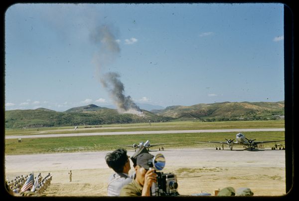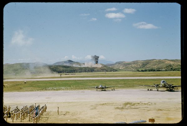 Editor: This photograph, "Dalende parachutisten tijdens een luchtgevecht bij Suchong," was taken by David Ketel sometime between 1952 and 1959. The tones are so striking, this interesting silvery grey of the plane against the beiges of the ground. What initially captures your eye? Curator: The immediate observation rests upon the spatial relationships depicted. Notice how the composition utilizes a low horizon line, emphasizing the expansive sky. This contrasts with the clustered forms of the tents and figures in the foreground. It’s quite clear that Ketel invites us to examine these tensions. How does this perceived tension contribute to the overall structure? Editor: That’s a great point! The contrast certainly creates a sense of depth. The parachutists in the sky almost look like afterthoughts compared to the more grounded scene, right? Curator: Indeed. Semiotically, the parachutists disrupt the otherwise rigid structure established by the grounded elements. This contrast prompts questions regarding the photographer’s intended symbolism, especially in conjunction with the carefully positioned American flag. Editor: Do you think the composition feels balanced? Curator: It is deceptively so. The weight is primarily on the lower half of the frame, balanced by the repetition of forms, consider the repetition between the plane's lines and the tent structures. I would also draw your attention to the subdued color palette – it unifies these otherwise disparate components. Editor: That's a perspective I hadn't considered before! Focusing on the visual elements has really shed light on the photograph's intricate layers. Curator: By examining its structural elements and composition, we can move beyond a purely documentary understanding and perceive the artistic intent embedded within the photograph.