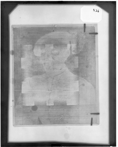Curator: This is an untitled work by Martin Schweig, referred to as a rephotographed portrait of a young man. Editor: It's striking, isn’t it? The stark contrast between light and dark gives it a slightly unsettling, almost ghostly feel. Curator: That effect is amplified by the way it reworks the photographic image. The inversion speaks to a kind of psychological unveiling. There's a history embedded in this portrait, a second look. Editor: Absolutely. The composition is simple, but the high contrast creates strong lines. The surface texture also looks interesting – I wonder what materials were used? Curator: It invites contemplation on how we perceive identity over time. The subject's expression, despite the inversion, still manages to project a sense of guardedness. It might mirror anxieties about changing selves. Editor: Perhaps. Or maybe it’s just a byproduct of the photographic process. It is an intriguing interplay of light, shadow, and the photographic frame itself. Curator: Indeed, a blend of the personal and the technical. Editor: Yes, a fascinating study.
