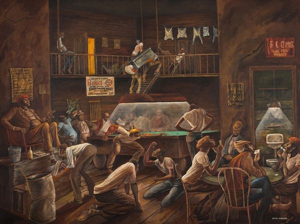 Editor: This is Ernie Barnes’ “Hustler,” an oil painting from around 1978. I’m really struck by the texture of the paint itself, especially how it defines the man’s face and clothing. What do you make of this piece? Curator: Looking at the surface and the materiality is key. Barnes wasn’t just depicting a scene; he was participating in a visual conversation about class, labor, and leisure through his deliberate use of oil paint. What kind of social context do you see represented here? Editor: I suppose the pool hall setting is a clue. It feels very working class to me, like a specific environment of masculine labor…even if the labor is somewhat illicit or unofficial. The man’s clothes, the pool table’s wear…they all contribute. Curator: Exactly! Consider the ‘means of production’ at play here: Barnes' application of paint to canvas acts as his ‘labor,’ mirroring the hustle of the man at the pool table. The oil paint itself, its source, and the social conditions of its consumption also need to be considered. It elevates what some might see as a mundane scene to an arena of complex interactions. Editor: So, it's less about just portraying a scene and more about commenting on the materials that define the situation itself? Curator: Precisely! We see the commodification of leisure and the negotiation of power happening on multiple levels, all represented and, in a sense, performed by the very act of painting with oil. Think of it this way: Barnes’ choice of realism allows him to underscore the tangible, gritty realities of his subject. The material of the painting becomes integral to understanding the hustle it depicts. Editor: I never thought of it that way. It's like the painting's own materiality is part of the story, echoing the themes of the game being played. It's made me rethink how art can communicate on different levels, not just visually. Curator: Indeed. Examining the materiality allows us to dig deeper into how the artwork acts as a historical object enmeshed within specific conditions of artistic and social production.