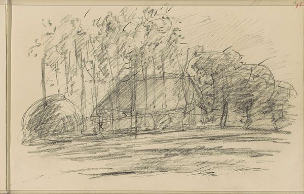 Editor: This quick sketch, "Roeiboot naast een boom bij een waterkant," or "Rowboat Beside a Tree at the Waterfront," by Isaac Gosschalk, likely from around 1860, it gives such a casual feel... Like a snapshot from a lazy afternoon. It looks like pencil on paper. I’m struck by the quiet intimacy of the scene. What’s your take on it? Curator: It's fascinating how a seemingly simple sketch like this can offer insights into the relationship between art and the emerging middle class in the Netherlands during the 19th century. Gosschalk, like many artists of his time, was capturing scenes of leisure. The placement of this sketch within the larger context of sketchbook art and informal artistic practices of the time suggests a shift towards a more personal and immediate engagement with the world. Why do you think artists began to favor these more 'casual' scenes? Editor: Hmm, perhaps it reflects a changing attitude, moving away from grand, historical paintings toward celebrating everyday life and accessibility for viewers? Curator: Precisely! The rise of a moneyed merchant class eager to express its own taste also created demand for more manageable sized artworks showing modern life. A quick sketch, something anyone could do— democratizing art, so to speak, as capturing ordinary moments. This connects with the developing concept of a “national identity” built not on battles, but a shared landscape and pastimes. Would you say this sketch helped create belonging among the burgeoning Dutch middle class? Editor: I see what you mean! This artwork now feels more relevant and layered than just a 'lazy afternoon'. There is indeed socio-political weight behind the subject matter and creation of the piece. I would not have noticed all that without your expertise! Curator: And I wouldn't have thought about my own position regarding class as directly if you hadn't commented about a snapshot from a "lazy afternoon". It always feels like a worthwhile endeavor looking at art!