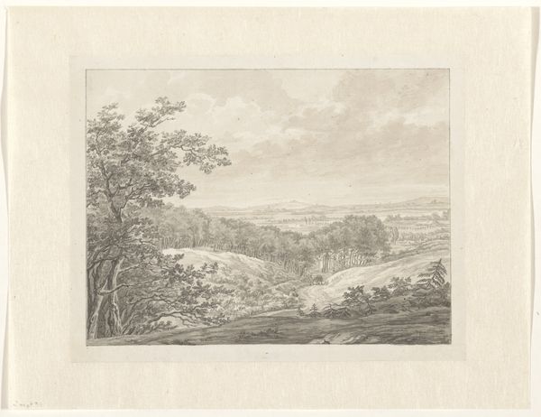 Curator: A rather dreamy cityscape before us today, wouldn't you say? This etching and print on paper, dating from around 1833 to 1880, is titled "Heuvellandschap met stad", which translates to "Hilly Landscape with City", created by Auguste Numans. It gives me a distinct feeling of peaceful solitude, something akin to looking at an untouched world in a black and white movie. What strikes you about it at first glance? Editor: A quiet pensiveness. There's something deeply nostalgic about the etching's depiction of a town nestled amidst rolling hills. It evokes a longing for simpler times, doesn’t it? And even beyond, the etching itself feels somehow significant; lines suggesting collective memory—etched into existence. Curator: Yes, precisely. Notice how the artist uses line work, probably pencil-drawn, to bring a sense of realism. The play of light and shadow seems calculated to draw the eye towards the distant cityscape, like he has used a silverpoint technique and has created a hazy horizon and also creates a slightly faded but detailed view, from an observant high up-hill angle? Editor: Indeed. The meticulousness reminds me of early cartography. Think of maps as psychological projections. The etching positions the viewer, much like cartographers did, as possessors of the landscape. The tiny figure walking with his dog…is he claiming dominion, or simply lost in contemplation? And that tiny, clustered village sitting neatly in that dip on the landscape - almost doll-like and precious, it sits innocently. Curator: I lean towards the contemplation, though that era often blurred the lines between observation and ownership. But do you think the figure represents someone specific to Auguste Numans, or a sort of romantic idealization? Also note how that road meanders; are we traveling toward something, or from? I suspect this journey symbolizes something larger. Editor: Possibly both. It touches upon archetypes – the wanderer, the community. These symbols trigger deep emotional responses; for instance, that lone figure stirs in me feelings related to safety versus vulnerability, domesticity contrasted with nomadic lifestyle… What this also represents through all those images in different formations; from the trees on either sides that stand guard to the village nested securely, and to the figure's posture which denotes calmness and purpose. Curator: Very well pointed out. It feels so much more intentional and thought provoking once everything is connected to deep embedded symbols, so perhaps a memory frozen in ink? That speaks to the human condition! Editor: Yes, frozen...a poignant reminder of the fleeting nature of time, but enduring power of symbols. This artwork prompts introspection - looking back on how cities were, which ultimately connects with personal narratives of all viewers - in an almost ethereal, surreal connection between image and psyche!