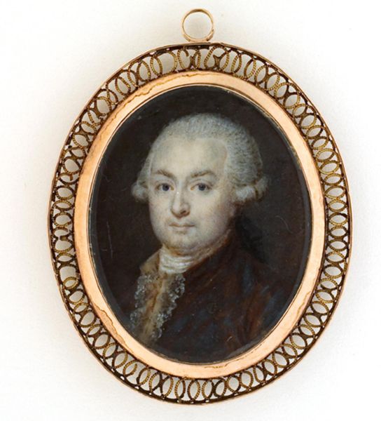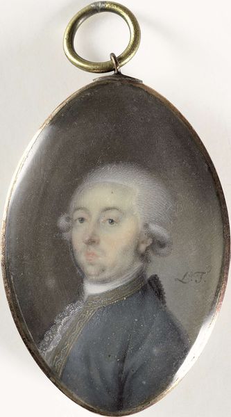 Curator: Alright, let's see. Editor: Here we have “Ubekendt mand,” or “Unknown Man,” painted sometime between 1756 and 1804 by Cornelius Høyer. It’s a miniature portrait. There’s a sort of faded elegance to it; almost like a cherished memory. What captures your eye about this piece? Curator: It feels like a whisper of powdered wigs and hushed conversations, doesn't it? Imagine carrying this tiny portrait close to your heart, a secret kept in a locket. What secrets do you think this man held? He's staring right through us, isn't he? It almost gives me a ghostly chill! Editor: He does have an intense gaze! Maybe a political secret, or a forbidden love? But look at the artistry: such fine detail in miniature! What’s your impression of the technique? Curator: Exquisite! Höyer truly captures the Rococo style here. Soft pastels blend so seamlessly; you almost don't notice the brushstrokes. The translucent skin...he’s giving us the luxury of 18th century in an enchanting bite-sized package. Think of the layers of meaning in this era of portraits: power, love, intrigue...and always, always mortality. Does that change how you perceive the image at all? Editor: It does! Thinking about it being kept as a locket—what a personal, almost intimate experience compared to today's portraiture. It's quite poignant. Curator: Absolutely, we could get lost pondering who he was! Sometimes, it's just about appreciating that quiet, reflective gaze that connects us across centuries. A little "who *are* you, oh powdered man!" I always appreciate pondering that, anyway. Editor: I like that. It's amazing to think about what stories an image can evoke, even without a name. Curator: Precisely. It shows you what art is: something bigger, better, deeper, broader.