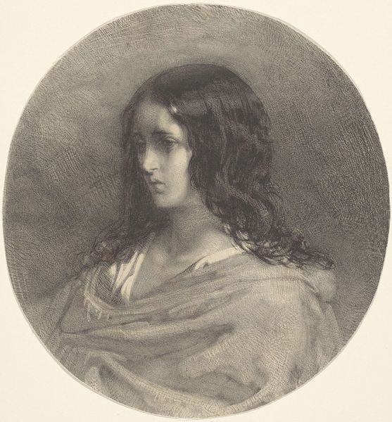 Curator: Looking at this work, "Lutetia" by August Allebé, completed sometime between 1848 and 1891 and currently held in the Rijksmuseum, I immediately notice its ties to academic art traditions, evident in its refined pencil work and focus on portraiture. Editor: The first thing that strikes me is how ethereal the drawing is. There's almost a Pre-Raphaelite softness to the depiction of the woman’s face and hair. The shading gives her a wistful, dreamlike quality. Curator: Absolutely. The medium and the style are very typical of the era. Consider the public exhibitions and Salon culture which promoted idealized beauty; it's easy to contextualize how Allebé strategically utilized portraiture. I think, we can ask how this work participated in shaping the public’s understanding of beauty and representation at the time. Editor: Well, let's explore the title: "Lutetia" refers to the ancient Roman name for Paris. The woman, then, can be interpreted as a personification of the city. We often see feminine figures representing nations and ideas. Could this be Allebé's attempt to embody the spirit of Paris itself? Her downward glance, though, hints at something deeper, maybe a pensive reflection on the city’s past, or a commentary on her role? Curator: An interesting take! The symbolic connection with Paris is key and certainly informs our interpretation. It's probable, though, that Allebé may have considered social shifts impacting Parisians rather than constructing an unambiguous endorsement of French nationalism. After all, realism also underscores many aspects of the work. The artist also painted several genre paintings; the "Lutetia" feels akin to studies he completed elsewhere, if, of course, bearing slightly more allegorical weight than, say, a milkmaid portrait. Editor: I see your point about the influence of realism and genre studies in the piece. Still, there is that allegorical presence we should not fully dismiss. In her features I glimpse at Roman bust depictions—not copies but subtle and indirect associations. It adds a layer of temporal depth: Paris superimposed on Roman heritage and projected back into Parisian society of the 1800s. The past as part of modern consciousness... Curator: True, there is no way to simplify these works; it all reveals a rich cultural tapestry influencing not just artists such as Allebé, but also shaping artistic and aesthetic taste overall. Editor: Precisely! This artwork has indeed allowed us to glance across a layered portrait: historical, societal and psychological at once.