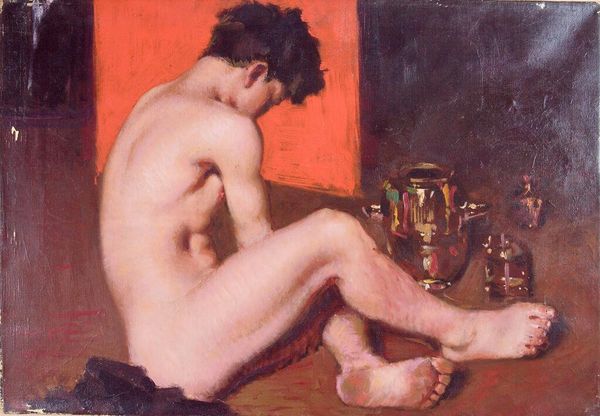 Editor: Here we have Denman Waldo Ross’s "David J. White", painted in oil on canvas. The sitter’s pose strikes me as both relaxed and strangely performative. What do you make of it? Curator: It’s interesting, isn’t it? The figure seems almost caught mid-thought, a moment of private reflection unveiled. The rough brushstrokes, the almost earthen palette...it hints at a raw, unfiltered emotion. Do you feel that tension between vulnerability and display? Editor: Absolutely, now that you mention it! It's like he's both posing and completely unaware. I hadn't quite picked up on that. Curator: Art, at its best, is like catching a fleeting glimpse of a soul in transit. Thanks for making me think more deeply about this one.