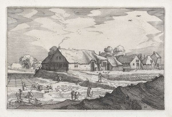 Editor: So, this is Claes Jansz. Visscher's "De weg naar Leiden," created sometime between 1612 and 1652. It's a drawing and print, combining etching and pen techniques. The sheer detail in such a small work is incredible! What symbols jump out at you in this landscape? Curator: The overarching symbol is, quite simply, the road itself. It's not just a path to Leiden, but a representation of life’s journey, laden with cultural weight. What reads to you about it? Editor: I notice that the people on the road are really small compared to the landscape, which creates a sense of human insignificance in the grand scheme of nature. Curator: Precisely. And how do you interpret that insignificance in relation to the recurring motif of windmills in the background? Editor: Well, the windmills, to me, show the relationship with human endeavors with harnessing the land... It feels optimistic and humanistic somehow. Curator: Indeed, the windmills carry multiple layers of meaning. On one level, they show the Dutch ingenuity of transforming landscape. Simultaneously, consider their vulnerability. Dependent on the wind, on external forces, their presence becomes a reminder of fortune’s wheel and change. This introduces a quiet tension, don’t you think? Editor: That's a fascinating insight! I hadn’t considered the potential precarity the windmills suggest. So, it’s not just progress but a potentially unstable one. Curator: And notice how even the placement and activity of the figures reinforces this. Some journey together, others till the land. What message is sent to you, with these arrangements and figures? Editor: Seeing those subtle connections, like the road as a symbol of life's journey, enriches my experience. It's much more than just a pretty landscape now. Curator: Exactly! Recognizing symbols unlocks a deeper understanding of the emotional and cultural values embedded within this art.