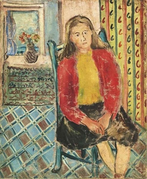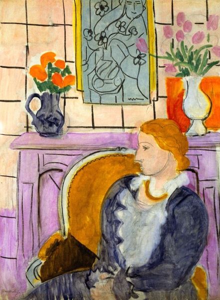 Editor: Here we have Henri Matisse's "The Violet Robe" from 1942, rendered with oil paint. What strikes me immediately is the flat perspective and the dreamlike quality of the color choices, somehow both soothing and jarring at the same time. It's a world that seems to hum. What do you make of it? Curator: "Hum" – that's a wonderful way to describe it! Matisse was all about exploring that harmonic, almost musical relationship between colors and forms. Think of his studio as a stage, always rearranging props and models to strike the perfect chord. In this piece, does the violet robe dominate the composition? Or does it complement the other colors in the scene? Editor: I'm not sure it dominates, but it certainly guides my eye around the canvas – it’s the element that pulls all the disparate colours together. Like a leading instrument. Curator: Precisely! And consider that intense time, World War II, the occupation… Matisse paints an *interior,* a refuge. The vibrant, almost defiant, color… that violet screams, "Even amidst darkness, there's beauty to be found." I bet his colours brought joy to others, too. Don't you think? Editor: Absolutely. It's an assertion of beauty, an escape, yes. A colorful ‘no’ to the bleakness. Curator: Exactly. And what have we got on the windowsill? Some plants, perhaps? Editor: It looks like brown vegetation. But it also might be something else, in Matisse’s world. Curator: Hmm… Indeed. This image reminds me of that notion of art not merely reflecting reality, but interpreting it through a lens of subjective experience. Almost an alternate universe! I like the brown vegetation, though; reminds me of one of my earliest memories. Anyway, what is *your* impression? Editor: It's funny, I came in seeing it as almost frivolous, but now I realize it's a quiet act of rebellion. Curator: See? Sometimes the loudest statements are made in the quietest rooms, and on canvases layered with beautiful, defiant color!