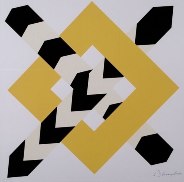 Curator: Allan D'Arcangelo's work, particularly "Constellation III" held at the Tate, intrigues me because of its bold shapes and industrial palette. It's roughly square, about 66 cm by 66 cm, and creates such a strong visual presence. Editor: My initial reaction is a sense of dynamic tension—the sharp angles and contrasting colors create a striking, almost jarring, composition. Curator: D'Arcangelo, born in 1930, often explored themes of technology and consumerism, using screen printing. It reminds me of the stark aesthetics of highway signage. Editor: The use of geometric forms evokes constructivist principles. The large blue triangle dominates, disrupting the more subtle interplay of black and off-white polygons. Curator: Exactly. The silkscreen process lends itself to such hard-edged forms, stripping away any trace of the artist's hand in favor of clean, mass-produced appeal. Editor: It's a fascinating intersection of form and production, how the technique influences the aesthetic and reinforces its message of technological modernity. Curator: Indeed. This piece prompts reflection on how mass production shapes our visual landscape, and the relationship between art and industry. Editor: Absolutely; it's a powerful distillation of form, color, and materiality to evoke a uniquely twentieth-century feel.
