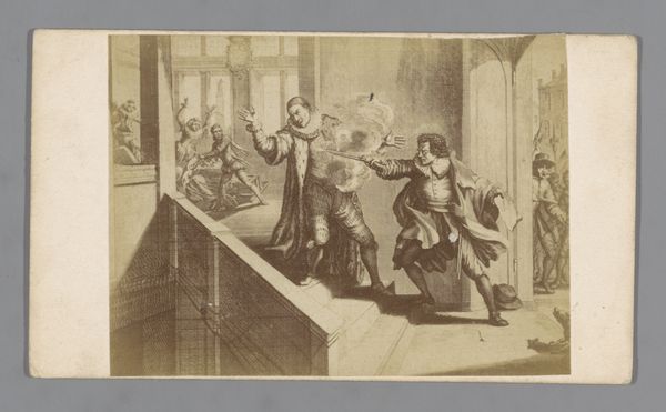 This is H.P. Hansen's illustration for Hans Christian Andersen's "A Story," rendered in ink. The composition immediately draws our eye to the elevated preacher, whose dramatic gesture contrasts sharply with the unfolding scene below. Note how Hansen uses line and perspective to create distinct visual planes. The rigid vertical lines of the church architecture and pulpit are juxtaposed against the dynamic, diagonal lines indicating movement amongst the congregation. The stark contrast in textures, from the smooth faces to the textured clothing, creates a complex interplay between stillness and action. The image destabilizes the expected decorum of a religious space by introducing an element of unrest, perhaps mirroring the story’s own disruption of conventional narratives. Hansen invites us to consider how visual structures can mirror and challenge social norms. He presents an ongoing discourse between tradition and rebellion, order and chaos, captured in a seemingly simple illustration.