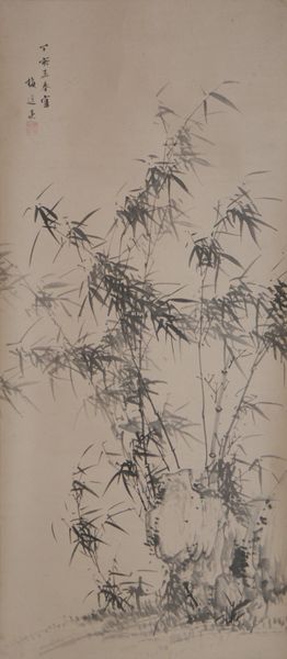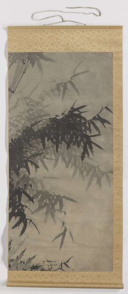 Curator: Here we have "Bamboo" by Oda Kaisen, a hanging scroll in ink on paper, created around the mid-19th century. Editor: Immediately, the striking contrast between the stark white paper and the delicate brushstrokes of ink gives it a meditative quality. Curator: The artist's process here is quite compelling. Notice how Kaisen uses varying ink densities to create depth and texture, particularly in the rendering of the bamboo leaves and the rocky outcropping. You can almost feel the flexibility of the bamboo, the roughness of the stone. Editor: Indeed, the minimalist composition contributes to its power. What do you make of its presence here in the museum collection, a work born of such specific historical circumstances finding a home within a Western institution? Curator: That's a valid point. Works like this circulated through global trade networks. Displayed within museums they take on new symbolic meanings; emblems of cultural exchange and, perhaps, of colonial collecting practices. Editor: This piece feels so inextricably linked to the social and political landscape of its time, doesn't it? Oda Kaisen was working within a specific set of cultural expectations, influenced by artistic traditions and patronage systems that shaped the means of production. It highlights how access to materials and training dictated who could produce such art. Curator: And further, one can't ignore the implied philosophical underpinnings. The choice of bamboo itself suggests certain virtues celebrated in East Asian art: resilience, integrity, adaptability. It’s an object lesson, visualized. Editor: Ultimately, “Bamboo" poses crucial questions about representation, cultural appropriation, and the shifting meanings art accumulates across time and contexts. Curator: Absolutely, it really invites us to reconsider not just the artist's technique but also the journey the work has taken. Editor: Precisely. I find it hard to forget the implications about our collection when looking at works such as this.