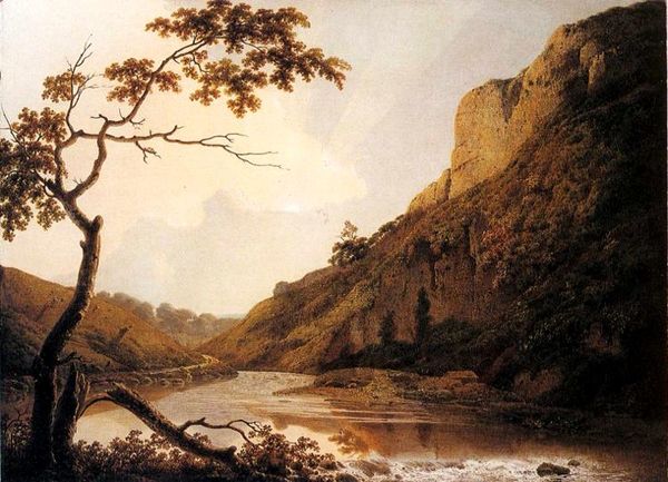 Joseph Wright of Derby’s ‘Landscape with Dale Abbey’ presents a serene scene dominated by muted, earthy tones and gentle gradations of light. The composition is structured by the tranquil lake that mirrors the sky above, dividing the canvas into two almost symmetrical halves. The eye is drawn towards the ruins of Dale Abbey in the distance, framed by the dense foliage and rugged cliffs that flank the water. The formal arrangement invites us to consider the interplay between nature and the remnants of human endeavor. Wright, working during a period of burgeoning industrialization, perhaps uses the landscape to reflect on the transient nature of human achievements. The ruins, softened by the encroaching vegetation, suggest a return to a natural state. The subdued palette and the subtle textures, achieved through delicate brushwork, evoke a sense of nostalgia and contemplation. The painting thus functions as a semiotic space where each element contributes to a broader narrative about time, change, and the relationship between humanity and the environment. This is not just a visual rendering but an essay on the aesthetics of decay and the philosophical implications of nature's enduring presence.