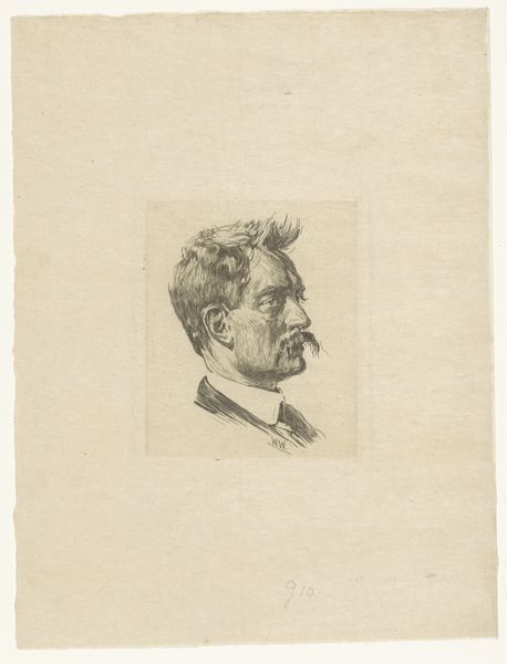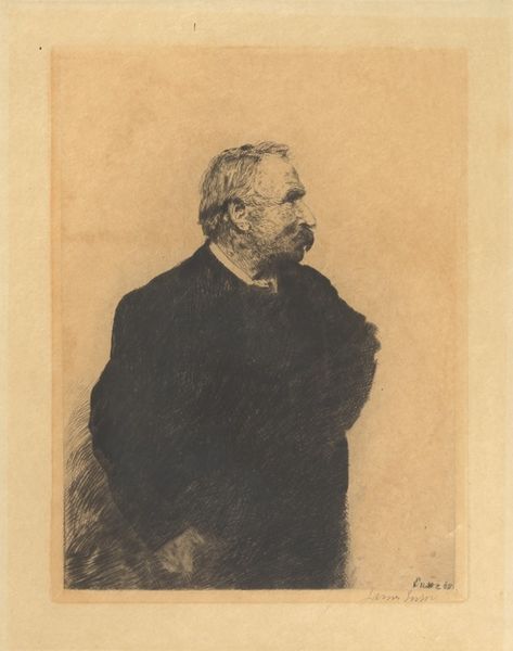 This portrait of Karl Legien is by Max Liebermann. It’s made using the etching process, a printmaking technique with a long history. To create an etching, a metal plate is first coated with a waxy, acid-resistant ground. The artist then scratches an image into the ground with a pointed tool, exposing the metal underneath. When the plate is dipped in acid, the exposed lines are “bitten,” creating incised lines in the metal. Ink is then applied to the plate, filling these lines, and the surface is wiped clean. Finally, the plate is pressed onto a sheet of paper, transferring the ink and creating the print. The crisp lines and delicate shading visible in this portrait demonstrate Liebermann’s mastery of this complex technique, one which carries a long history of both artistic and commercial reproduction. Notice how the marks vary in density and direction, giving form to Legien's features and clothing. The portrait's success depends on the skilled labor involved. Paying attention to materials, process and social context helps us understand this artwork, inviting us to question traditional boundaries between fine art and craft.