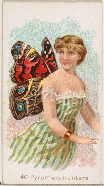 Card 35, Limenitis Sybilla, from the Butterflies series was issued by Wm. S. Kimball & Co. as one of many collectible cards included in cigarette packs during the late 19th century. These cards reflect a fascination with natural history, but they also reveal much about the cultural values of the time. By depicting a woman with butterfly wings, the card blends the beauty of nature with idealized femininity. This intertwining of woman and nature evokes prevailing notions about women’s delicate beauty and ornamental function in society. The woman is adorned with jewelry, a signifier of wealth and status, while the butterfly wings amplify her perceived fragility. Such images circulated widely, shaping and reinforcing dominant ideas about gender and class. They invite us to consider the ways in which representations of women and nature have historically been used to convey social meanings, and how these meanings continue to resonate today.