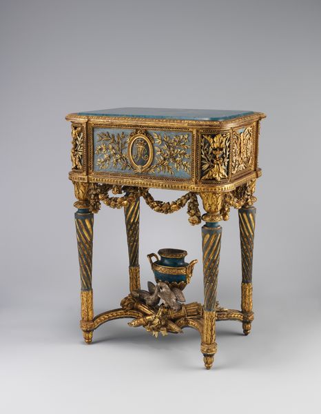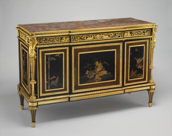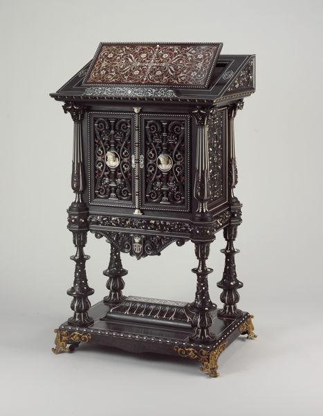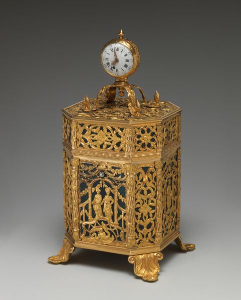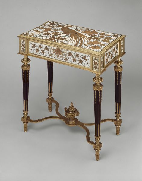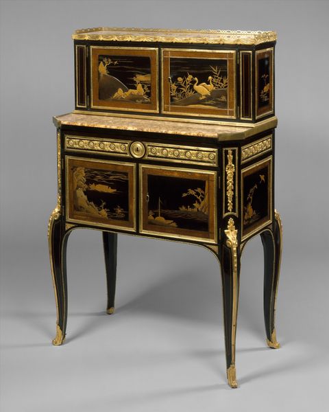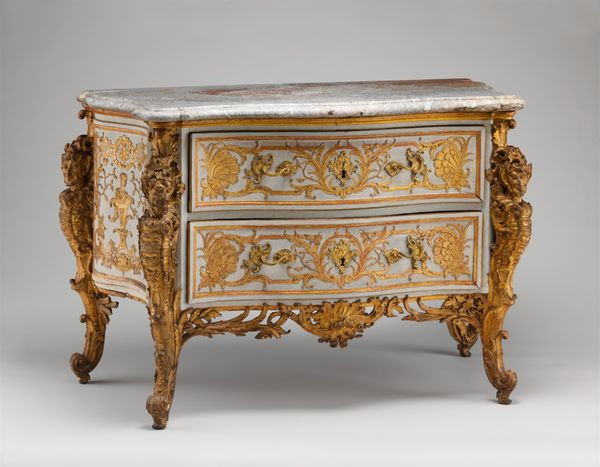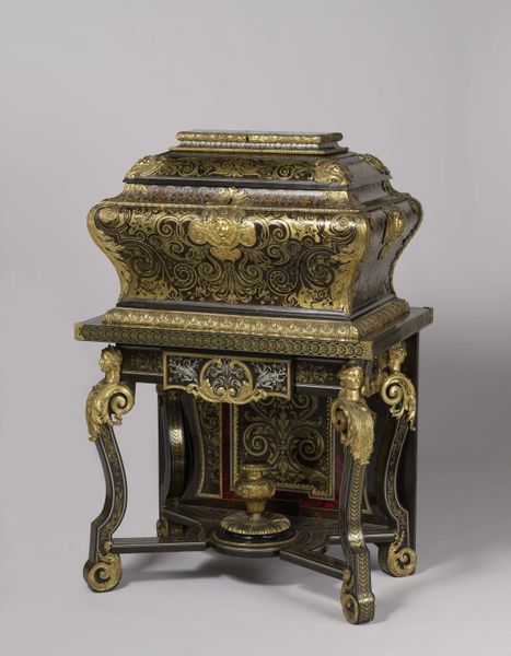 Curator: What strikes you first about these 'Two toilet caskets' crafted circa 1685-1690 by André Charles Boulle? Editor: The sheer opulence of the materials. Look at how wood and metal combine—the detailed marquetry contrasting against heavy gilded mounts. I'm curious about the labour and access required to acquire the precious materials to make such an object. Curator: Absolutely. Boulle was *the* cabinetmaker to Louis XIV, so access to the best materials, and workshop, would not be an issue. These caskets were luxury items for the court, objects intended to enhance the rituals around personal grooming, hence their purpose. Imagine the powdered wigs, the perfumes, all carefully arranged from within these caskets. Editor: Personal grooming taken to the level of ritualistic display... The layers of craftsmanship tell us about social expectations; appearances became almost a performance, reflected even in furniture design. The very detailed process speaks volumes. Curator: The Baroque style here isn’t just decoration. It reflects a courtly culture of display and centralized power. Each swirling detail, each shimmering metallic piece, serves to enhance that visual and cultural language. It signals status. Editor: Do you think it has similarities to other craft work made around the time period or is this a singular commission. Are we looking at 'art' or 'craft'? I wonder who made this? Was it Boulle himself or his workshop? And were there enslaved or underpaid people providing the raw materials or creating these luxurious pieces? Curator: It's all connected, of course. Boulle certainly designed the piece but oversaw the entire production process within his workshop, probably dividing labor for different artisans focusing on various areas of specialism. As for similarities, the general aesthetic chimes in with the fashions of Versailles – controlled splendor! However, while some may dismiss it as merely decorative, objects like this embody an artistry inseparable from its cultural impact. The elite controlling of design and production reflects wider systems of authority. Editor: I see the tight interweaving of craft and power. Thank you! Curator: A powerful object. And a beautiful object too.