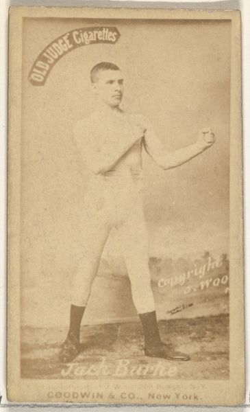 Curator: The sepia tones and straightforward composition lend it a timeless, almost heroic quality. A sort of "everyman" figure ready to compete. Editor: That's an interesting take. The "Old Judge Cigarettes" ad feels rather out of place these days. These trade cards from 1887-88 featuring athletes like James E. Larkins were inserted in cigarette packs to encourage sales. It speaks to how marketing and celebrity culture were taking shape in late 19th-century America. Curator: Indeed, the cigarette brand is part of the image now. It becomes its own cultural artifact reflecting not just the man but also the marketing trends. What stands out for me, though, is how Larkin's pose connects him to a classical idea of strength. See how his one arm protects his face and the other swings at the camera. Like a Greek bronze. It transcends its promotional purpose. Editor: I agree about that connection. These cards served multiple functions; they boosted sales while documenting contemporary athletes. It shows how sport became increasingly popular. In his attire – or lack of it – the artist is looking to recreate something historic through the new medium of photography. This new interest and recording method contributed to his status. Curator: Absolutely. And that very format – the small, easily-traded card – made his image incredibly accessible, building a wider sense of shared cultural icons and almost inviting an audience for sporting events and the very lifestyle it represents. Almost like an orthodox icon acting as a holy link between common people and god-like figures, here we are sharing his divine strength. Editor: Precisely! It is mass-produced 'holiness', and points to larger debates about commodification of image and personhood during this pivotal moment in mass culture. The success of men like Larkins and products like Old Judge relied on it. So a fascinating case study indeed. Curator: It certainly makes you consider how much has changed, and what hasn't, when it comes to fame and advertising. It is an honor to stand and share my point of view. Editor: It shows the deep-rooted historical and sociological meaning this image still has, giving the trade card a rich contemporary value. Thank you for sharing your points!