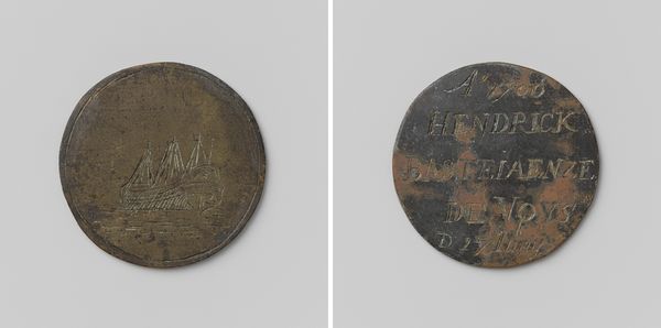 Curator: So, we're looking at a bronze engraving titled "Generaal Hoven te Mons gevangen genomen"—roughly translated, "General Hoven Taken Prisoner at Mons." The piece is dated sometime between 1830 and 1839. It seems to be a commemorative medal. Editor: Immediately, I’m drawn to the circular format. It feels… contained. Like history itself, neatly packaged. And the color… this burnished bronze speaks of age, conflict, stories whispered through time. Curator: The medal commemorates the capture of General Hoven, likely during the Belgian Revolution. Understanding the revolution is key here. It was a turning point, challenging established power structures and leading to Belgium’s independence. Think of it as part of a broader wave of 19th-century nationalism and liberalism. Editor: It's like holding a tiny echo of a revolution in your hand. Can you imagine what it felt like to be present at that moment? The energy! I almost feel the need to clutch it and join the streets in fierce shouts! Curator: Absolutely! Medals like these served a powerful purpose. They were instruments of propaganda and commemoration, solidifying a particular narrative and reinforcing national identity. The inscription details the event. Look at the deliberate crafting of a national memory in bronze. Editor: I notice, too, the slightly uneven etching. It brings in this interesting hand-made quality. This almost intimate contrast is what grabs my interest: brutal event, intimate portrayal. There’s real weight in how something like this exists. Almost like poetry written by gunfire. Curator: It's a fascinating point – the tension between mass production and the individual maker. The very act of circulating such images, though, served a broader political purpose. It amplified a specific reading of events that favored the revolutionaries and newly independent Belgium. Editor: When you zoom in on it you start feeling this immediate contact between now and then, it really closes a gap. It invites introspection… What kind of bravery—or foolhardiness—would drive you to get caught during wartime? Curator: That’s a wonderfully individualistic way to engage with this. I tend to gravitate towards viewing such objects through a lens of historical accountability, particularly understanding how they operate within the socio-political sphere. Editor: Yes! In the end, even these perspectives form the basis for what it really means to interpret artwork from a different temporal point. To examine the dialogue this little thing still makes, from within time itself. It's pretty cool, you know?
