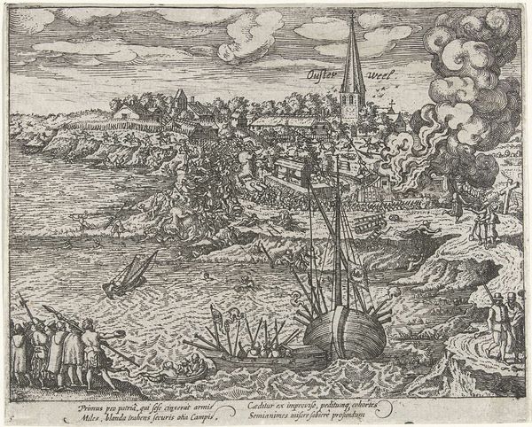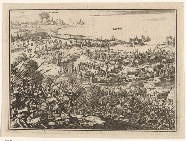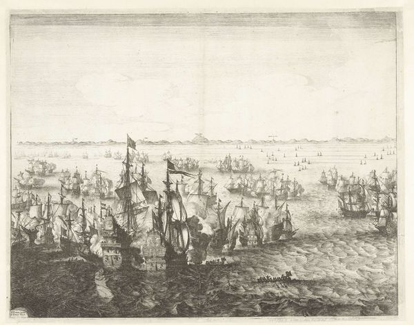 Editor: So here we have Herman Padtbrugge's "Zeeslag," created between 1674 and 1676. It's a detailed engraving depicting what looks like a chaotic naval battle. The detail is impressive considering it's a print. What strikes me most is how the artist rendered such a large scene with so much detail using just lines. What do you see in this piece? Curator: For me, the crucial element is understanding the *making* of this image. Think about the labor involved in creating such a detailed engraving. Every single line had to be etched into a plate, reflecting a very physical and time-intensive production process. How does this manual, reproductive process speak to ideas about Dutch maritime power at the time? Editor: That's a fascinating perspective! So, rather than focusing solely on the depicted battle, you’re more interested in the process behind creating and distributing such a powerful image? Curator: Exactly. Consider how the mass production of prints like this would disseminate imagery of Dutch naval victories—or, perhaps more interestingly, narratives of naval power even when the reality might have been more complex. It becomes less about historical accuracy and more about manufacturing consent, a consumable image reinforcing national identity. Did these prints reach a broad audience? Were they commissioned and controlled by specific entities to communicate the power of industry in war? Editor: I see. So you're suggesting the value of the print lies not just in its artistic merit, but as a product deeply intertwined with the Dutch Golden Age's political and economic strategies? Almost like propaganda, in a way? Curator: Precisely! By looking at the materiality of the engraving, its method of production, and the implied audience, we can understand it not just as art, but as a commodity actively participating in shaping perceptions of power. Editor: This makes me think about how differently we interpret an artwork when we look at the artist's choices. I had just noticed it as an artful expression; you encouraged me to analyze how images served a greater purpose through labour and consumerism. Curator: Precisely. It's not just about seeing the art; it's about understanding the whole network of relationships that brought it into being and gave it meaning.