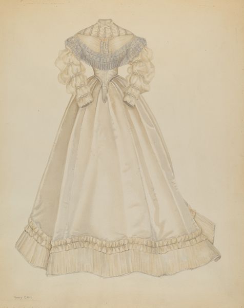 Curator: The artwork before us is a drawing entitled "Dress," crafted circa 1937 by Roberta Spicer. It appears to be rendered in colored pencil. What's your immediate impression? Editor: My immediate impression is one of contained elegance. It evokes a sense of bygone modesty, almost stifling, yet there's also a fragility suggested by the medium and the muted palette. The way the skirt flares makes me think of confinement, like a bell jar. Curator: Indeed. The dress is positioned within a lineage of similar fashions, yet viewed through the lens of the late 1930s, the echoes of Victorian constriction become palpable. Spicer, of course, lived in a very different world, yet still reflected that sensibility. Editor: How interesting to view it like that, rather than simply dismissing it as old fashioned. The stripes and floral vines almost seem to compete for space, suggesting social tensions. This garment hints at how gendered power operated through prescribed behavior, performativity, and the language of adornment. Curator: Precisely! Consider how fashion magazines shaped perceptions of ideal womanhood, creating aspirations. This seemingly innocuous drawing served within those influential forces that shaped perceptions of beauty, social class and more, creating norms of conformity. What messages do you think "Dress" projects regarding societal standards and expectation for women's dress, appearance, and role? Editor: This pattern speaks so subtly to the ways expectations bind, or can simultaneously uplift. We can reflect, perhaps, upon whether anything has really changed. And as for that tiny black belt! A tight constriction, certainly visually striking. What is being constricted in the quest for this particular silhouette? And in what ways have images like this been used politically to enforce norms? Curator: I think it raises salient questions about how fashion drawings and depictions of garments operate in a cultural space. Ultimately it provides a window into both that era's artistic output, but also its value systems as perceived through art and public image, allowing a deeper, multi-layered understanding. Editor: For me, reflecting on its social context, it really serves as a potent reminder of our shared, and contested, history, highlighting the ways in which dress both embodies and influences societal expectations and norms surrounding gender, class and expression. It encourages me to push toward futures of inclusion and acceptance of difference.