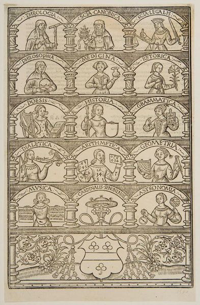 Editor: This intriguing print, titled "Seven Liberal Arts" by an anonymous artist, divides the arts into stacked registers. What is particularly striking is the way each figure is framed within an archway filled with tools and materials. How do you interpret this work? Curator: It's a fascinating glimpse into the hierarchy of knowledge. Notice how these "arts" – agriculture, architecture, even surgery – are personified as women. What does that say about the accessibility, or lack thereof, to these fields in the time this was made? Editor: That's an interesting point, especially considering how male-dominated those fields would later become. Curator: Precisely! This work reflects a moment in history where the conceptual understanding of these disciplines was being shaped and disseminated, in ways that are both familiar and foreign to our modern sensibilities. I’ve learned a new perspective today. Editor: Me too, thank you!