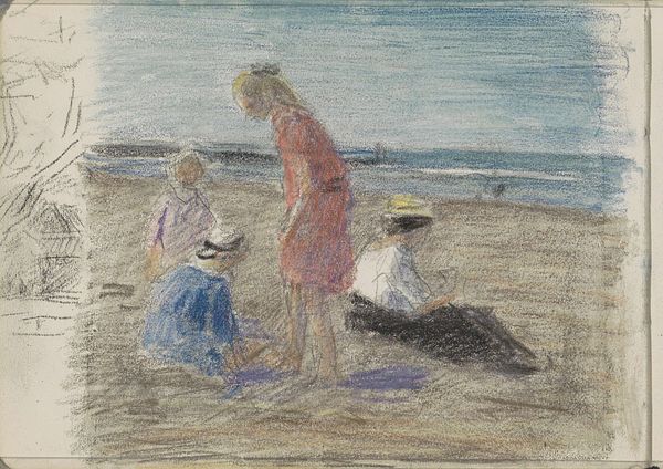 Curator: Liebermann's "Spielende Kinder am Strand," or "Children Playing on the Beach," completed in 1898, captures a casual seaside scene through an Impressionistic lens. The painting's broad strokes and muted palette render a lively, if fleeting, moment. Editor: Oh, I get a serious whiff of childhood freedom here! Just look at those blurry kids digging away, their focus so intense you can almost hear the shriek of seagulls. It feels real, raw somehow, doesn't it? Not overly romanticized. Curator: Liebermann's Impressionistic style aligns with the plein-air movement; that's painting outdoors, right on location. He's clearly prioritizing capturing the light and atmosphere of the moment over precise detail, an ethos that gained significant traction amongst artists at the time, as academic traditions around artistry waned in significance and new ideas grew from them. Editor: The grays and browns are unexpectedly soothing, even though the subject matter—a gaggle of noisy kids on the beach—could easily lean into chaos. Maybe it’s because he doesn't overdo it with bright colors. There's a melancholy touch as well that contrasts the youthful exuberance of the scene portrayed. I imagine Liebermann enjoyed this subject. Curator: Exactly. The brushwork and limited color choices speak to the social realism embraced by many late 19th-century artists. The figures are not idealized; instead, their postures and clothing indicate ordinary working-class children. These paintings allowed ordinary audiences to experience aesthetic practices as cultural spectators. Editor: Makes you think about the stories behind each little blob of color, doesn't it? Who were they, and what did their lives really look like beyond this captured snapshot? I imagine the sounds that reached the artist. The damp sand between his fingers and the everpresent salty mist. He must have loved painting *en plein air.* Curator: Indeed, and with Liebermann’s prominent role within the Berlin Secession, this work also illustrates broader shifts in the art world towards rejecting academic traditions for more direct and modern visual forms. Editor: So, from a hazy day at the beach to a window into social shifts? That's the power of seeing, I guess. Curator: Precisely. The beauty of art history. Thanks for your perspective, I learned so much from your personal reflections.