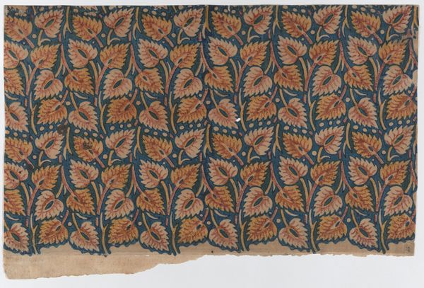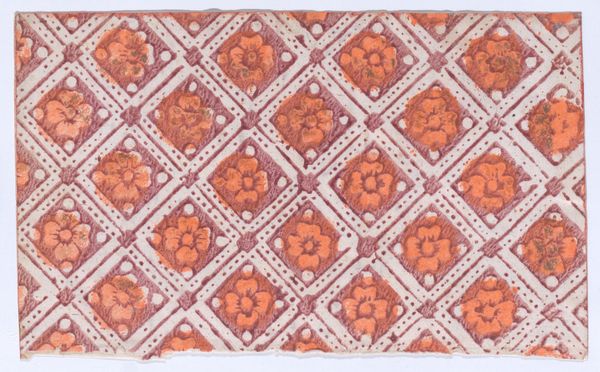 This is a small, anonymous sheet featuring a star and leaf pattern. The design is dominated by a regular grid of alternating floral and geometric motifs set against a textured reddish background. The pattern invites a semiotic analysis. Each shape carries cultural associations—the starburst suggests celestial or idealized forms, while the leaf pattern evokes nature. Arranged in a grid, these images lose their naturalistic context and instead become visual signs within a structured field. The alternation of floral and geometric shapes creates a tension between organic and constructed forms, destabilizing any fixed interpretation. The small scale emphasizes the artwork's function as a sample or fragment. The regular, repeating nature of the pattern points to the broader context of decorative arts and textile design, where modular units combine to create larger aesthetic systems. It's a reminder that even seemingly simple patterns are built upon complex layers of cultural meaning.