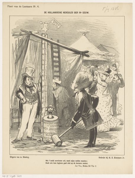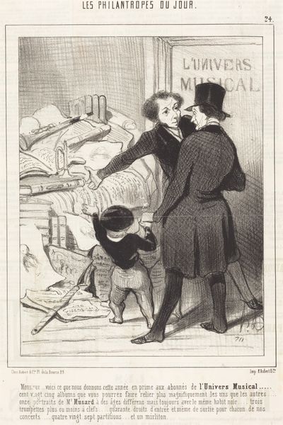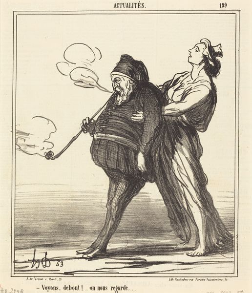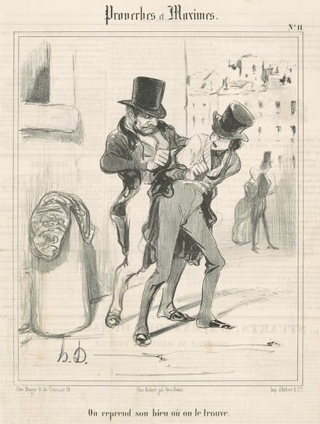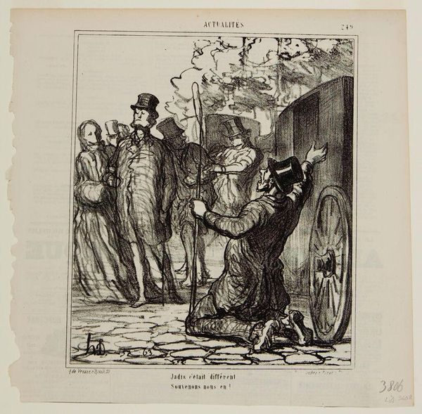 Editor: This is Honoré Daumier’s 1867 lithograph "Jadis c'était différent." It’s a print showing figures in a street scene, with one man kneeling beside a carriage. I'm struck by how much the heavy lines contribute to a sense of, well, maybe desperation? What do you see in the piece, considered purely as an arrangement of forms and lines? Curator: It's a piece driven by contrast. Note the dynamism injected through the composition’s stark juxtapositions, not just light and dark, but also the figure’s pronounced curvature against the architectural lines of the carriage and the posture of the standing figures. Does this not introduce an implied tension, perhaps even an implied narrative, built solely from its formal structure? Editor: Absolutely. The bowed figure really leaps out against those static bodies behind him. It’s almost like Daumier's exaggerated perspective intensifies the drama. How much does the technique inform that exaggerated sense? Curator: Precisely. Observe how Daumier masterfully employs cross-hatching to build depth and texture. This is an area the artist excels in, enriching the image plane through what amounts to structural mark-making and line variation. Editor: That use of cross-hatching to describe form… I hadn’t fully appreciated the impact. Curator: Daumier utilizes lithography to explore and interrogate social mores, using only stark value relationships, and the dynamism suggested by the composition. Do you think the lack of color information impacts our assessment? Editor: It might actually intensify it, because we look closely at composition and use of values as shape. Curator: Indeed, removing color encourages this concentrated reading of line and form as the primary language of the piece. Now that we've looked at line, shape, and formal relationships, hopefully viewers now share a richer and more formal appreciation of this engaging artwork! Editor: Yes, understanding the dialogue between figure and form really does enhance its narrative force!
