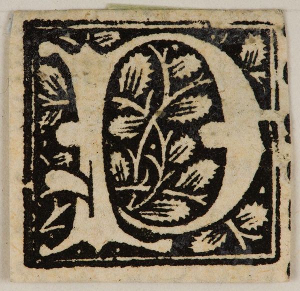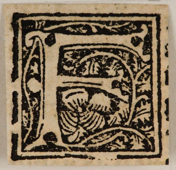 Editor: This is "Initial F," an anonymous work held at the Harvard Art Museums. It's graphic and bold, with a clear interplay of black and white. What sort of deeper significance do you see in this initial? Curator: The letter "F," embedded within foliage, is more than just an alphabet marker; it's a vessel of cultural memory. Consider the historical context: initials often marked the beginning of sacred texts, a visual key to unlocking narratives. Does the natural imagery suggest growth, perhaps even a sense of hope or paradise? Editor: That's a fascinating way to look at it. I hadn't considered the connection to sacred texts or the potential symbolism of the foliage. Thanks! Curator: My pleasure. It’s always rewarding to explore how such images carry cultural weight.
