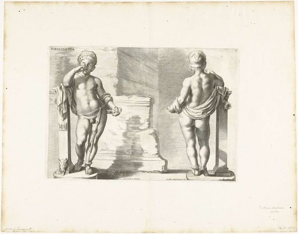 Curator: This drawing, titled "Ontwerpen voor aankondigingen," or "Designs for Announcements," was created between 1773 and 1805 by Jacob Schwartzenbach. It’s currently held at the Rijksmuseum. Editor: It's delicate, almost like lace. The symmetry and those cherubic figures framing the empty ovals give it a very formal feel. Awaiting text! Curator: Exactly. Schwartzenbach was designing announcement templates here. You see the combination of etching and engraving which allowed for such fine detail in reproducing these. It also makes the process very interesting; the material considerations are critical to the social purpose. Editor: Absolutely, it reveals the intent for wide distribution. Looking closely, I find it interesting how these symmetrical frames imply a specific hierarchy for the information that was meant to be inscribed inside. Each frame becomes an official declaration in itself. Curator: Indeed. The allegorical figures support that: look at how the materiality of ink, etching, and the printing press democratized communication while also providing means for centralized authorities to use these forms for official purposes. Consider what kind of labour might be involved, and under what kind of working conditions... Editor: That interplay between control and accessibility is fascinating. The choice of the Baroque style, with all its elaborate ornamentation, also speaks to the era’s values and the persuasive power of imagery within the context of print. This imagery reinforced established social and political systems, making a perfect template for propagating news. Curator: So, by examining the materials and printing process, we can understand its implications, not only for how the announcements might have looked, but also for who was making and consuming the information. Editor: And viewing them now, removed from their original time, we can observe both their aesthetic qualities and consider how these visual declarations played a role in their historical moment, influencing public discourse and civic life. Curator: Right! This piece highlights the means through which information was materially disseminated and its broader social effects. Editor: Yes, it shows the announcement not only as text, but as a tool for visually shaping public opinion.