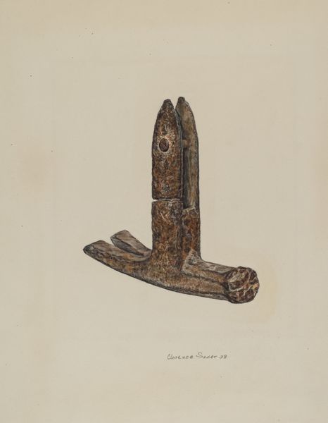 Curator: Ah, this one always makes me smile. Chris Makrenos created this watercolor, appropriately titled "Nutcracker," sometime around 1940. Two studies of the object are placed one above the other. Editor: What strikes me is how unassuming it seems. It's a simple object, meticulously rendered, yet there's a strange potency. That ram's head—I'm drawn to its calm intensity. It feels like something ancient. Curator: Rams are indeed deeply symbolic. Think about Aries, the zodiac sign of springtime, of forceful beginnings, of virility... Makrenos has chosen a potent symbol to adorn something as mundane as a nutcracker. Editor: Precisely! It's that friction that interests me. On one level, it is simple and purely functional—but is there an intentional irony? A humble object crowned with an animal associated with power? What do you think it says about the person using it? Curator: It makes you wonder, doesn't it? The ram is also linked to stubbornness. Perhaps cracking nuts isn't just about extracting something sweet. It's about overcoming a challenge, a miniature, delicious conquest. Editor: That’s it, yes. And what about the material? Watercolor lends it a delicacy, a softness that belies the actual use of the tool. And that slightly off-kilter angle of the bottom rendering introduces a quirky imperfection. Curator: True. And perhaps this relates to a more general story that water colors may hold for art of the inter-war period, and even earlier than that. Before Pop Art really arrived in full bloom, humble renderings such as these stood for quiet dignity, modest domesticity, even during tough times. Editor: I see a sort of bittersweet, melancholic element in the chosen medium and realism... It elevates a common, everyday utensil, transforming it into an intimate study. Curator: It's amazing how a simple kitchen tool can hold so much depth! Editor: Absolutely! Makes you question all your tools—I feel ready to give them another look.