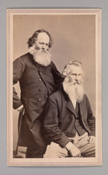 Curator: Here we have an albumen print, a photographic portrait of Karl Marx dating back to 1875. Editor: A striking image. There's something incredibly leonine about him here. That massive beard, the powerful set of his jaw—it's all terribly commanding. Curator: Indeed. And it’s key to remember that in the formal conventions of portraiture, especially photography from this era, pose and expression are so calculated. It's a study in constructed authority. Editor: Authority certainly comes across. The weight of history and intellect seems embedded in that gaze. One can't help but read revolutionary fervor into it. What did it mean to make such images at the time? Was he building a particular visual legacy? Curator: I believe so. Let us note that this photographic print, rendered with incredible detail, showcases a full view of him in a seated posture. The composition balances formality and ease. Editor: Consider that dark coat. Doesn't that symbolize serious authority at that moment? But at the same time, he is sitting, and that is somewhat modern. A person willing to listen, and not towering. I sense some contrast between his intention, as a leader and an intellectual. Curator: And, that would certainly mirror the dualities that saturated his writings. Perhaps this portrait by John Mayall perfectly captured this complex representation. It allows us access into Marx as a political and even philosophical signifier. Editor: Absolutely. These artifacts freeze in time potent signifiers that echo throughout generations. Looking at it today—what do you think he means now in terms of symbolism? Does his face spark specific ideas? Curator: Certainly. Even beyond economics, Marx’s image conjures discourses of justice, labor, and capital – visually shorthanding incredibly complex systems. Editor: To be able to evoke that much history through an albumen print; I find it astonishing. Curator: The power of semiotics captured through this remarkable artifact—a testament to the times and, even more so, to history itself.