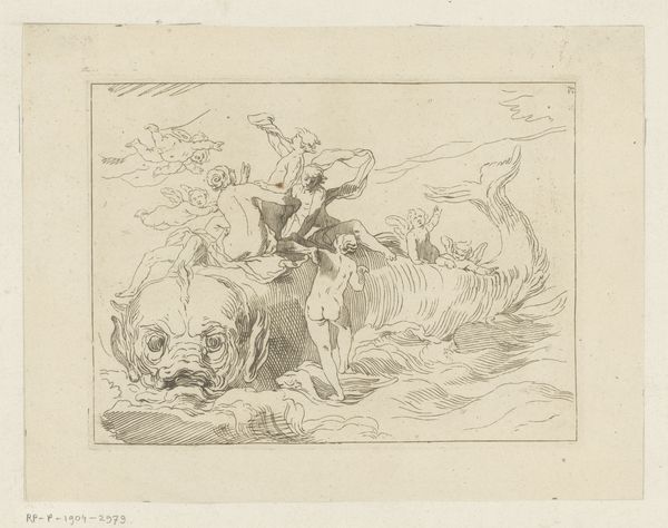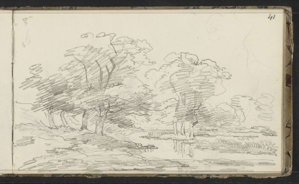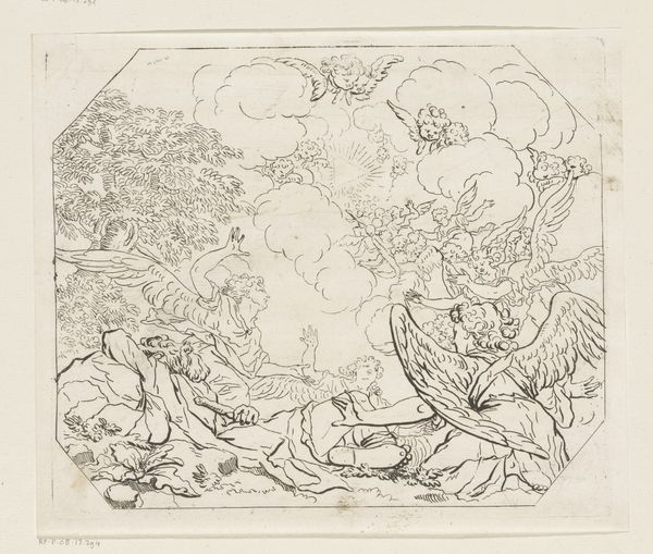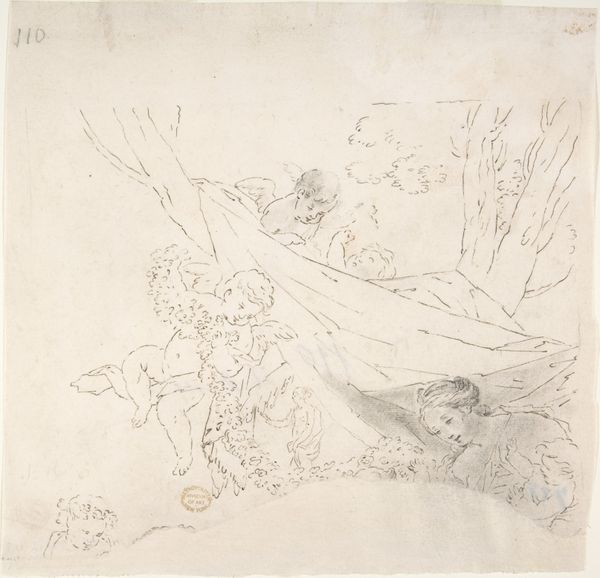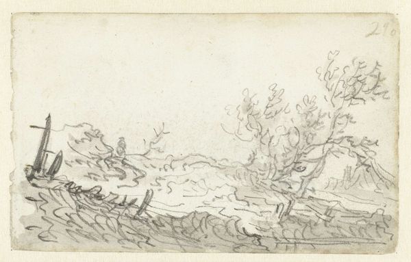 Curator: The moment my eye lands on this ink and pen drawing, a feeling of wandering settles over me. Like a journey both physical and internal. Editor: Before we get too carried away, should we mention we're looking at Friedrich Metz's "Heroische Landschaft mit Hirten", now housed at the Städel Museum? It’s rendered simply in ink. What draws you in so immediately? Curator: It's the lightness, the ephemeral quality. He captures the essence of a landscape more than its specifics. The lines feel almost like a memory fading, like trying to grasp a dream of open space and movement. The heroic element seems to be the quiet bravery of facing such vastness. Editor: Heroic, yes, but I'm drawn to the *how*. Look at the furious hatching making those cloudscapes, almost architectural, then that gentler shading implying form upon the land. His labor—the time spent dragging that pen—transforms common material, plain paper, into an idea of nobility. The labor suggests that 'heroic' quality wasn’t a simple glance for Metz. Curator: Precisely! There's a yearning baked into the technique itself. It’s less a declaration and more an attempt to feel closer to nature's power. That yearning translates into the sketch itself; the marks aren't just descriptive, they are expressive. There's also that small figure that he included: that really adds something Editor: See how easily he positions labor: pen across the page to, literally, shepherd upon the plain. Is that so distant from the artisanal and manufacturing processes we would be more familiar with? Curator: Not distant at all, if we consider them attempts to communicate ideas using tools. The romantic yearning just transforms them into something magical. But you're right to pull it back to the physical – what IS heroic if it's not embodied? Editor: Exactly! So while you see ethereal dreaming, I'm compelled by that down-to-earth process—pen on paper—and its resonance throughout human history. A humble material elevated by simple hard work. Curator: A truly heroic material, wouldn't you say? Editor: Fitting, yes. Now I see both labors; the artist’s AND the imagined shepherd’s, walking on.