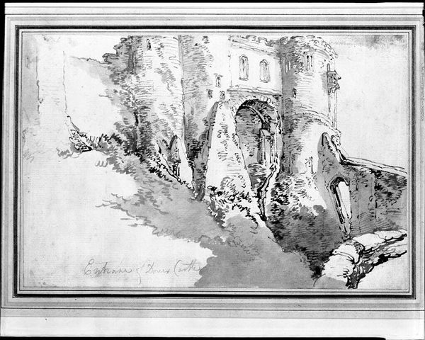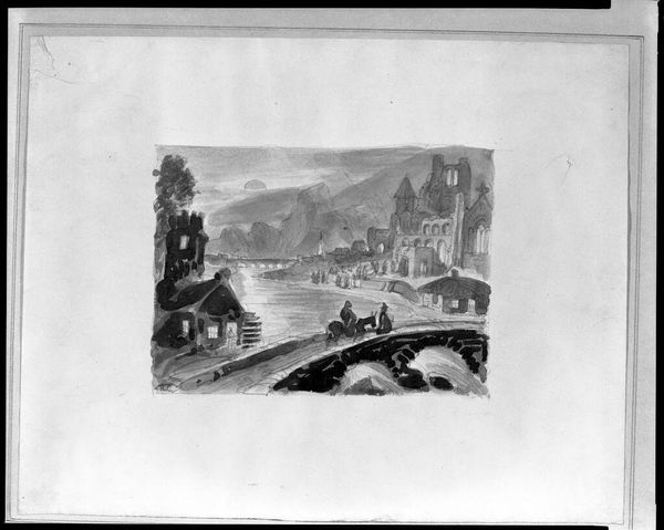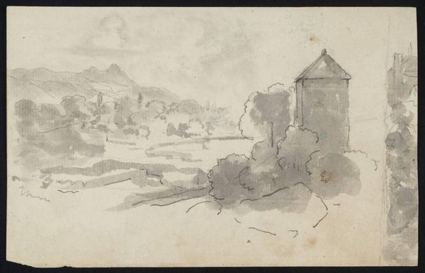 Curator: Here we have Florent-Fidèle-Constant Bourgeois du Castelet’s “View of an Italian Hill Town” in the Harvard Art Museums collection, a watercolor measuring about 8 by 12 inches. Editor: It feels ghostly, doesn't it? Like a memory half-faded. The hill town, almost monochromatic, perched precariously on that rocky outcropping... Curator: Precisely. Consider the materials: paper, watercolor. Bourgeois du Castelet, whoever he was, opted for readily available materials suggesting a more functional than decorative intention. Editor: I see a crumbling fortress, softened with wisps of trees. It whispers stories of sieges, romance, and long lost battles. Maybe the artist felt that too, a connection with the past, filtered through a personal lens. Curator: Perhaps, or perhaps the artist was simply recording the topography for future military campaigns. The lack of precise detailing lends itself to functional reproduction for strategic purposes. Editor: You might be right, but I still feel the ache of history here. Curator: And I appreciate the simple effectiveness of the materials to suggest so much about their time.
