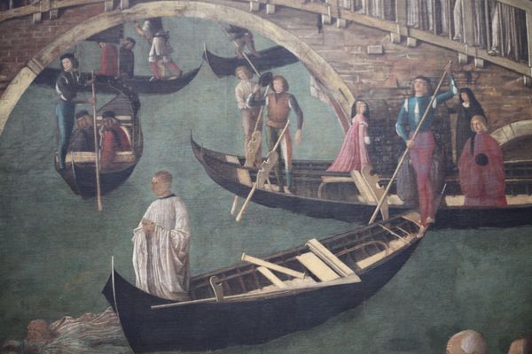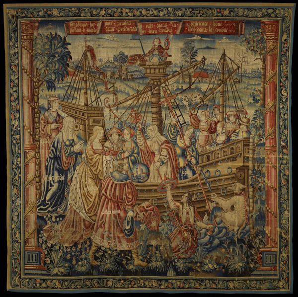 Editor: Here we have Antoniazzo Romano’s "La Navicella," a tempera painting from around 1485. The surface has aged, creating an interesting texture, but overall the composition strikes me as quite still and symbolic. What do you see in this piece? Curator: I find myself immediately drawn to the formal construction of the piece. Consider the juxtaposition of the grounded figures in the foreground with those afloat, both spatially and symbolically elevated on the boat or, even further, depicted among the clouds above. Notice the carefully balanced asymmetry: the inclination of the boat and figure pulling someone from water contrasted by the orthogonal construction of the sail. What visual tension might these choices create, do you think? Editor: That's interesting. I guess the figures create one visual rhythm while the rigid geometry of the sail holds a completely different note. And the gold halos throughout, do they contribute to the overall composition, or are they simply narrative elements? Curator: The halos contribute significantly to the overall structure. They are formal devices creating unity through repetition, echoing shapes found throughout the composition while also reinforcing the spiritual narrative. The linear perspective, though not perfect, directs the eye, emphasizing the figures. How does the artist's use of line and form draw you into the story? Editor: It really brings out the drama in an otherwise balanced tableau. Looking at the lines forming the waves, you feel Peter's struggle but the balance of the painting keeps a symbolic tone. Curator: Precisely. And within that struggle is beauty. A beauty created through masterful execution and pictorial syntax, a compelling representation that asks us to contemplate human frailty. This work serves as an entry point into further exploring similar techniques throughout the Italian Renaissance. Editor: Seeing it that way has given me a lot to think about. The formal elements aren't just there to look pretty but really guide the eye to create this meaning beyond the narrative.
