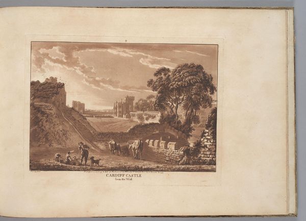 Jakob Wilhelm Christian Roux made this print of the Haardtgebergte using etching. This landscape creates meaning through its visual codes, cultural references, and historical associations. Produced in the early 19th century, likely in Germany, this scene presents a rural idyll, a vision of harmonious life and labor. The rising smoke hints at human activity and the presence of industry, however the figures working the field are central to the composition. The geography of the Haardtgebergte, with its rolling hills and fertile land, would have influenced the choice of subject matter. Prints such as this would have circulated among a growing middle class, fostering a sense of regional or national identity. The imagery comments on the social structure of its time, idealizing rural life. To understand this artwork better, we can delve into archival records, exploring travelogues, local histories, and economic data from the early 19th century. Art’s meaning is contingent on its social and institutional context.
