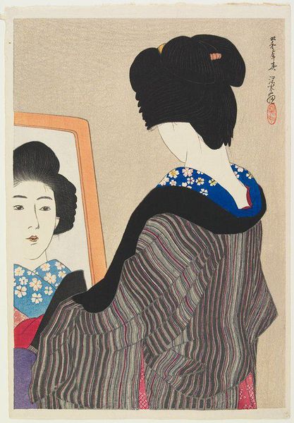 Editor: This woodblock print from 1920, titled "Actor Nakamura Ganjirō I as Akaneya Hanshichi" by Yamamura Toyonari, is really striking. The muted colors and the sharp profile create a sense of quiet drama. How do you interpret this work, especially in its historical context? Curator: This portrait offers a compelling lens through which to view early 20th-century Japanese society and the role of Kabuki theatre. Beyond being a simple likeness, the print engages with complex issues of representation, gender, and the construction of identity. What does it mean to portray a male actor *as* a specific role, Akaneya Hanshichi? Editor: I guess it highlights the performative aspect of identity, blurring the lines between the actor's self and the character. The details in the costume feel significant too, maybe referencing the character's profession or social status? Curator: Precisely! Toyonari is inviting us to consider the social and political dimensions of Kabuki. Who had access to this art, and what did it mean to see a particular story or personage represented? Think about how Kabuki often served as a vehicle for social commentary. Were there issues the play sought to expose or critique? Editor: So, it's not just about appreciating the aesthetics, but also understanding the broader dialogue about power, representation, and social change that the artwork participates in. I hadn’t thought of it that way. Curator: Exactly. Considering how this artwork operates within a network of meaning, linking artistic practice with social and political discourse, enriches our understanding. This image gives us an opportunity to question established narratives and to amplify the voices of marginalized communities. Editor: I see what you mean. It’s a lot more than just a portrait; it’s a window into a particular cultural moment and the societal forces at play. Curator: Absolutely, and a reminder of art's potential to reflect and challenge the status quo.